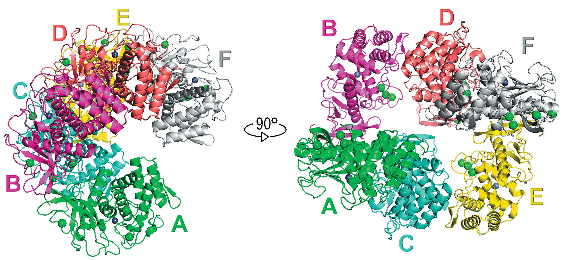 Рис. 2. Кластер-прекурсор (гексамер) кристалла термолизина в двух проекциях. Буквами A–F обозначены мономеры, составляющие гексамер. Зелеными сферами показаны ионы кальция, серыми – цинка.