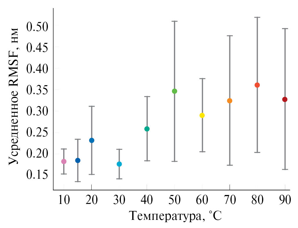 Для структурного выравнивания по начальному положению атомов термолизина использовали команду gmx trjconv. Значения RMSF (среднеквадратичные флуктуации) вычисляли только для атомов Cα с помощью команды gmx rmsf. Значения RMSF сначала усредняли (с вычислением погрешности на основании несмещенной оценки дисперсии) для каждой температуры по независимым моделированиям (трем или пяти в зависимости от температуры); затем значения RMSF и погрешности (стандартные отклонения) дополнительно усредняли по всем атомам Cα.