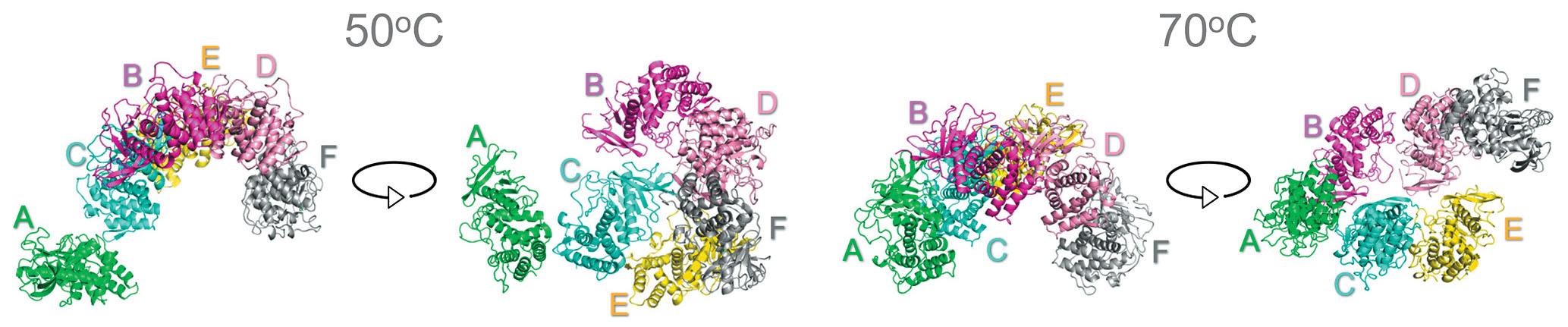 Рис. 4. Наименее стабильные гексамеры в конце моделирования (100 нс) в двух проекциях при 50 (слева) и 70°C (справа). Молекулы термолизина не отрываются от гексамера даже в ходе МД самых неустойчивых структур.
