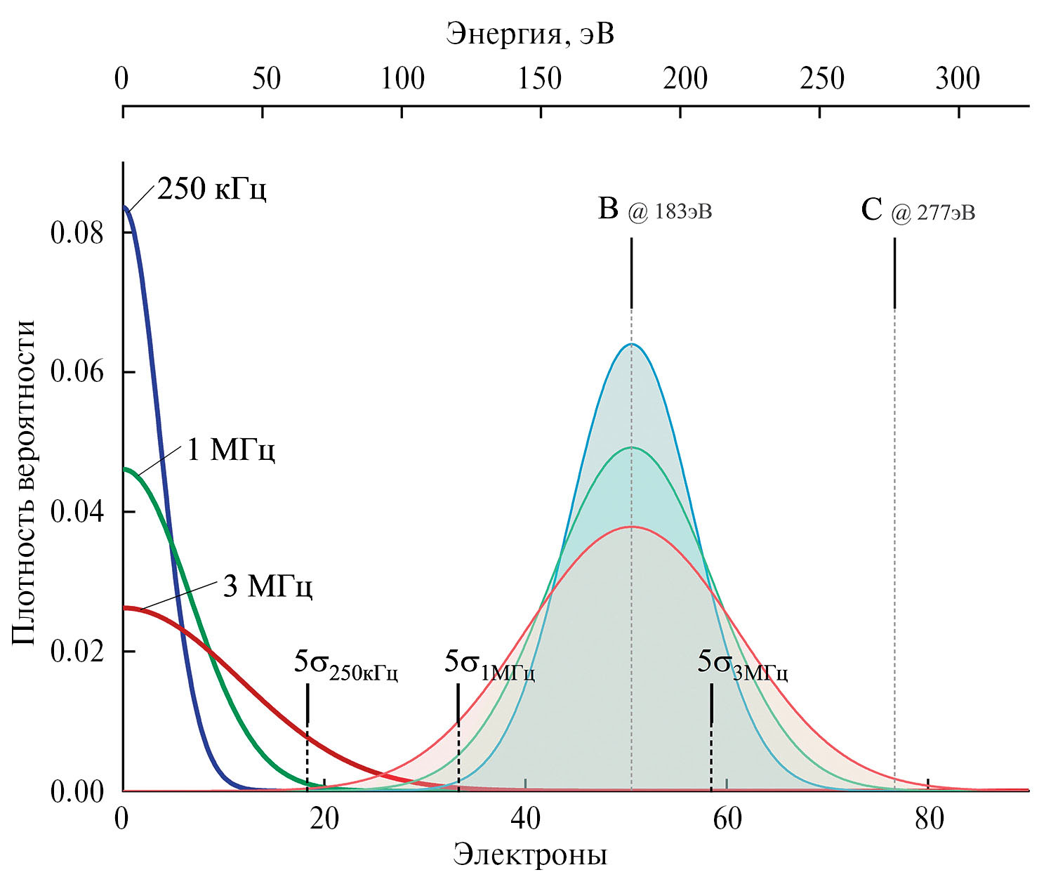 Оптимальный порог дискриминации – пять среднеквадратичных отклонений распределения шумов считывания по амплитудам (5sread). Он соответствует вероятности ложного срабатывания 2.86 × 10–7, или примерно одному неверно определенному фотону на три–четыре кадра, что практически полностью исключает появление шума в нижней части энергетического спектра. Для стабильной регистрации низкоэнергетического рентгеновского излучения порог дискриминации должен быть меньше максимумов соответствующих спектральных линий. Для регистрации флуоресцентного излучения бора и углерода необходимо использовать частоту считывания до 250 кГц. При высоких скоростях считывания выбранный порог дискриминации будет либо эффективно усекать линии бора и углерода, либо добавлять в спектр линию шумов, перекрывая полезный сигнал. Это иллюстрирует рис. 2, где представлены распределения шумов считывания, а также зависимость ширины спектральной линии бора от частоты считывания ПЗС-матрицы: 250 кГц, 1, 3 МГц.