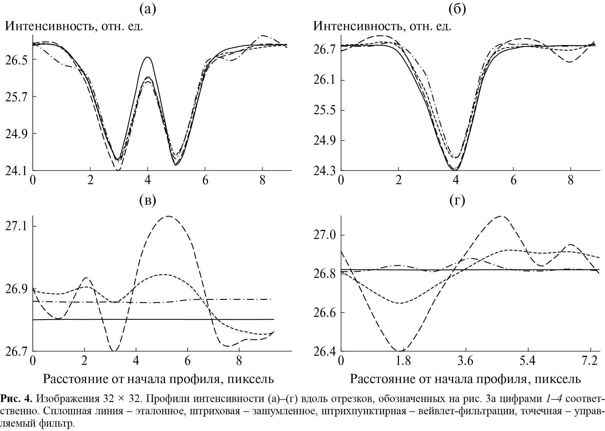 Рис. 4. Изображения 32 × 32. Профили интенсивности (а)–(г) вдоль отрезков, обозначенных на рис. 3а цифрами 1–4 соответственно. Сплошная линия – эталонное, штриховая – зашумленное, штрихпунктирная – вейвлет-фильтрации, точечная – управляемый фильтр.
