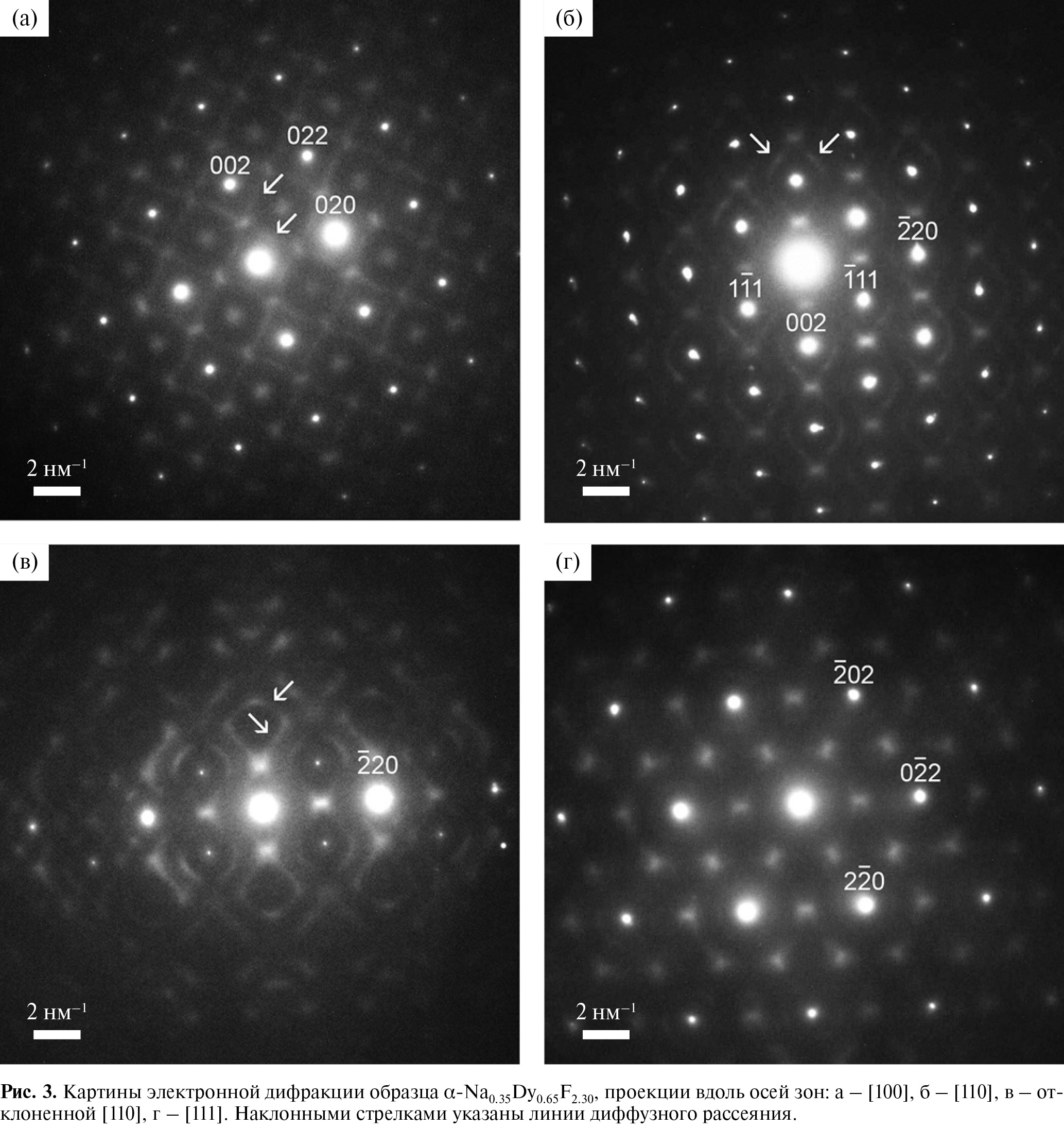 На картинах дифракции электронов в α-Na0.35Dy0.65F2.30 также присутствуют линии диффузного рассеяния, отмеченные на рис. 3 наклонными стрелками. Их присутствие означает, что во флюоритовой матрице α-Na0.35Dy0.65F2.30 наряду с пластинчатыми выделениями фазы со сверхструктурным упорядочением присутствуют выделения с размерами ~5.55 Å, что соответствует одной элементарной ячейке флюорита состава Na0.375Dy0.625F3.25 [30].