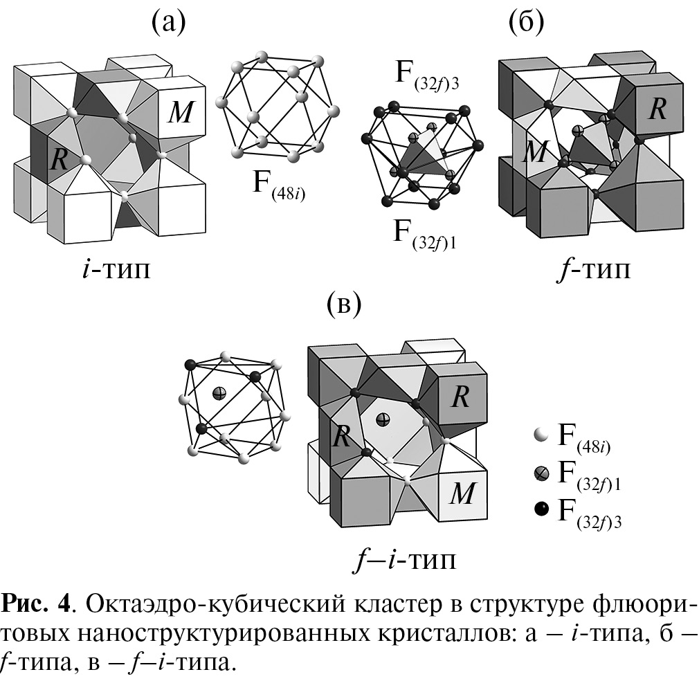 Тип структуры кластерных областей в таких кристаллах отличен от типа флюорита. Дальний порядок в расположении кластеров в наноструктурированных кристаллах отсутствует, поэтому такие кристаллы сохраняют кубическую симметрию. Распределение катионов по позициям в октаэдро-кубическом кластере происходит согласно их размерам. Большие по размеру катионы располагаются в вершинах элементарной ячейки, поскольку при таком расположении объем их координационного полиэдра наибольший. Меньшие по размеру катионы располагаются в центрах граней элементарной ячейки в полиэдрах меньшего объема. В кластере f–i-типа в структуре β-KR3F10 в центрах граней элементарной ячейки расположены катионы R3+.