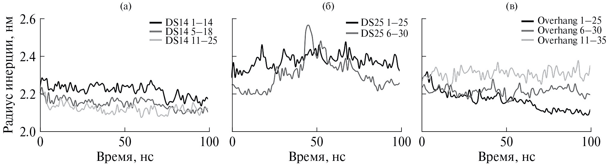 Рис. 3. Колебания величины радиусов инерции в процессе МД-моделирования, вычисленные для комплексов HUMgal с тремя ДНК-дуплексами: а – DS14 в позиции 1–14 (черный), 5–18 (серый) и 11–25 (светло-серый); б – DS25 в позиции 1–25 (черный) и 6–30 (серый); в – Overhang в позиции 1–25 (чрный), 6–30 (серый) и 11–35 (светло-серый).