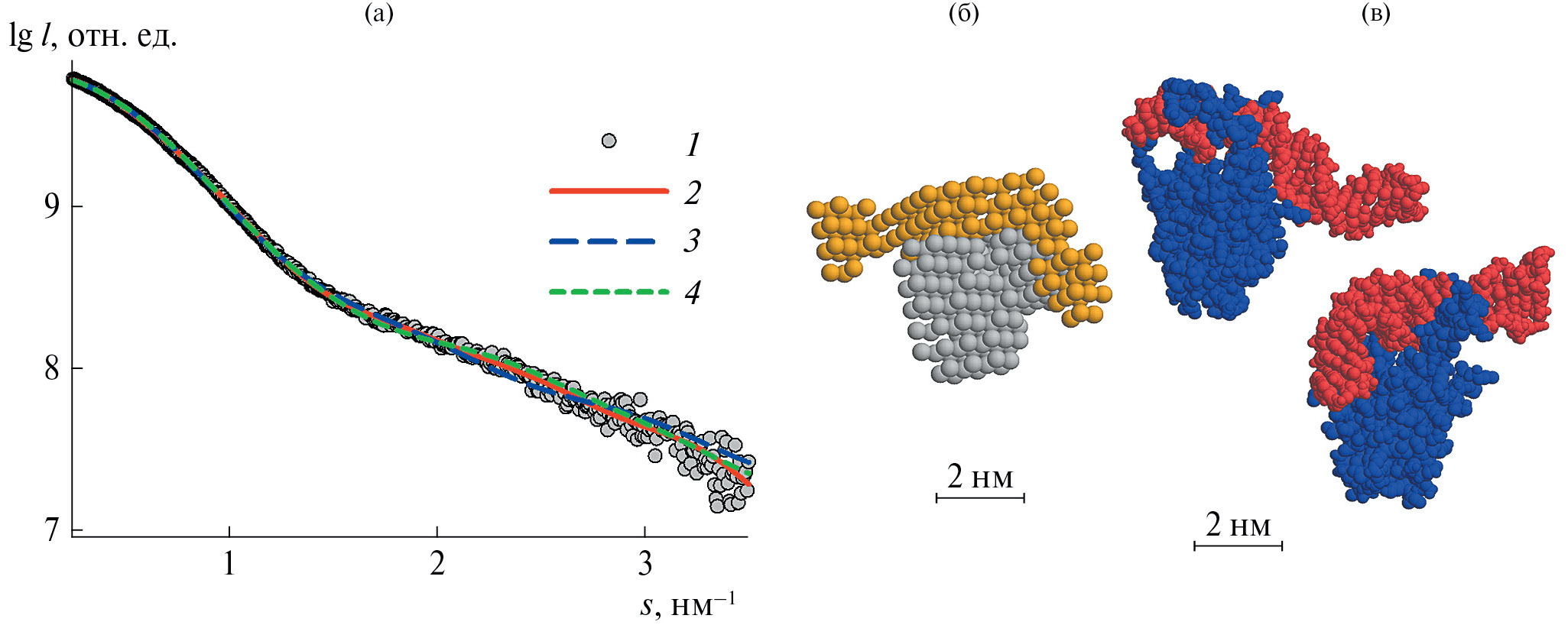 Рис. 5. Моделирование структуры комплекса белка HUMgal с олигонуклеотидом DS25 в растворе: а – профили МУРР: 1 – экспериментальные данные МУРР, 2 – приближение мультифазной ab initio-моделью, 3, 4 – приближения двумя наилучшими моделями, полученными МД; б – шариковая ab initio-модель, полученная в программе MONSA; в – две наилучших МД-конформации комплекса, выбранные с помощью программы CRYSOL. Белок и ДНК на панелях б и в показаны разным цветом.
