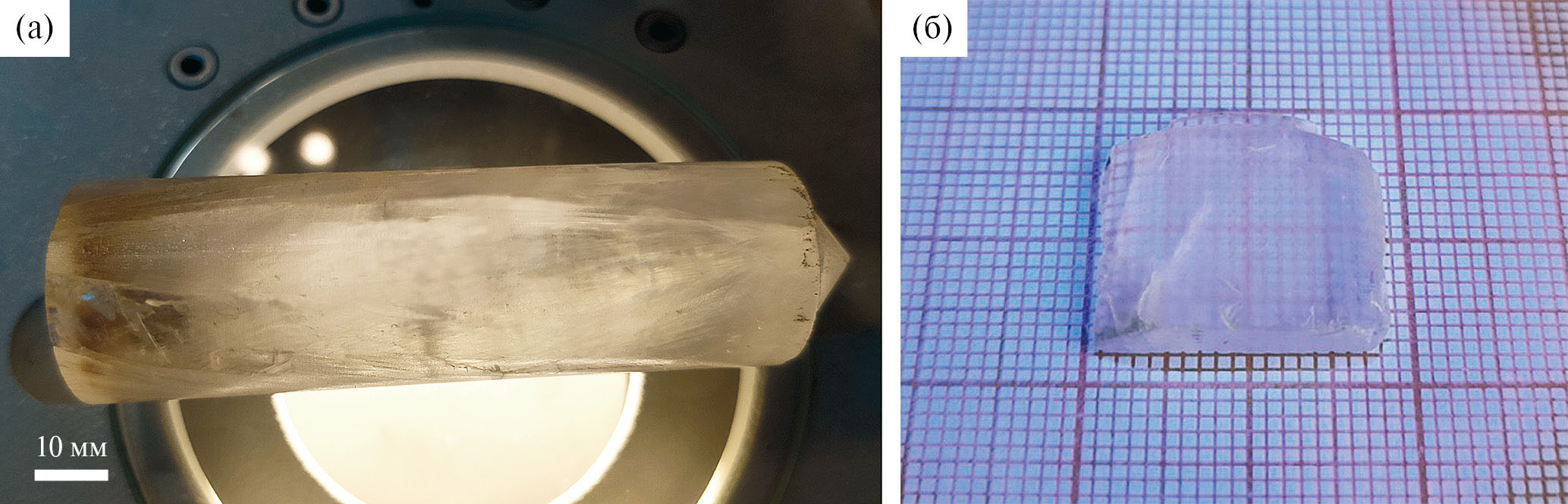 Рис. 1. Выращенный из расплава монокристалл п-терфенила (а) и изготовленный из него оптический элемент (б).