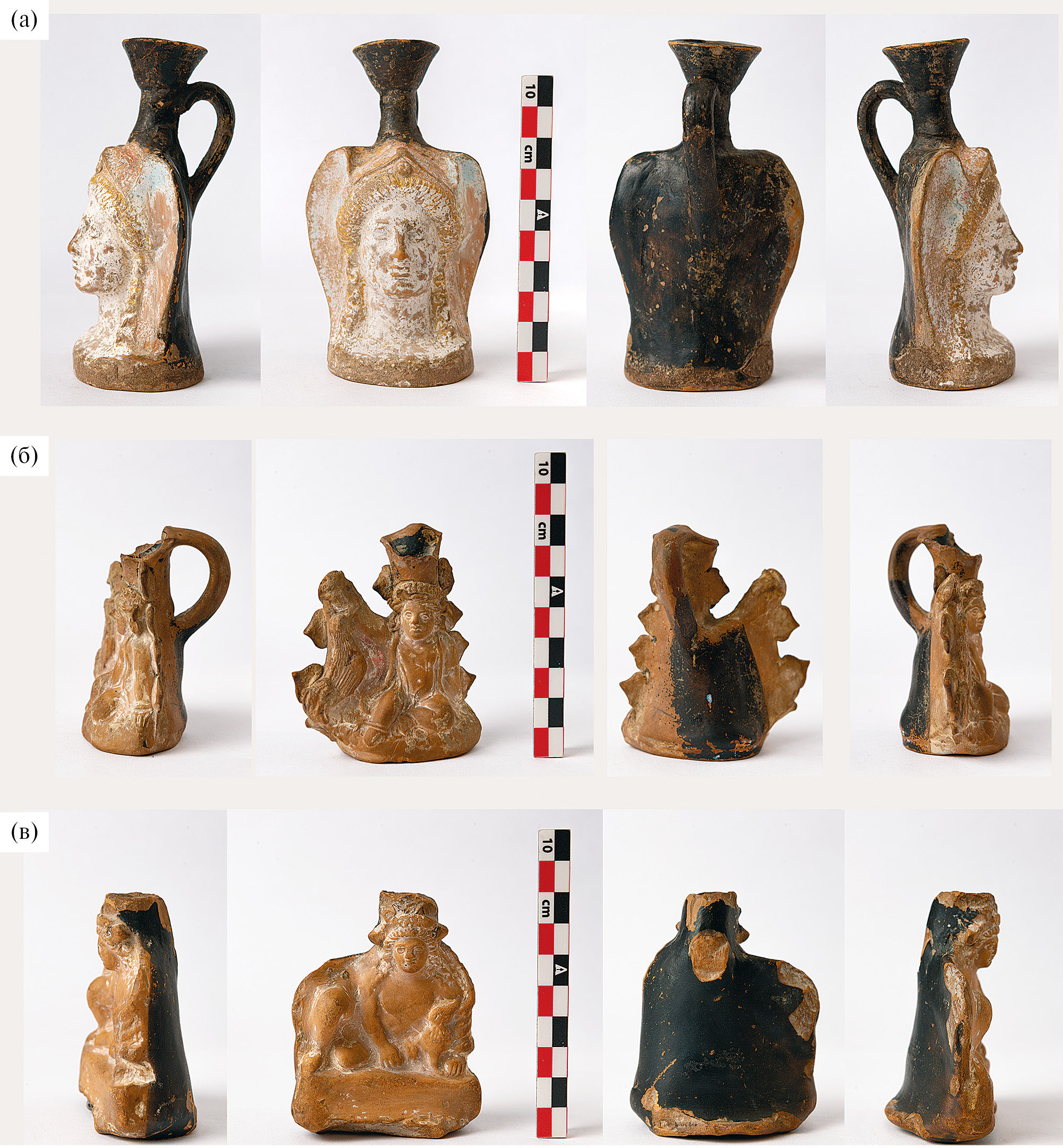 Лекиф в виде женской протомы (рис. 1а), судя по распахнутым по бокам крыльям, представляет богиню Нику. На голове у нее треугольная диадема, декорированная розеткой, поверх наброшено покрывало, спадающее вдоль шеи. Кудрявые волосы уложены в пышную прическу, отдельные локоны спадают вдоль шеи. Близкие аналогии, представляющие фигуру целиком, происходят из коллекции Лувра [6, p. 77. № 41].