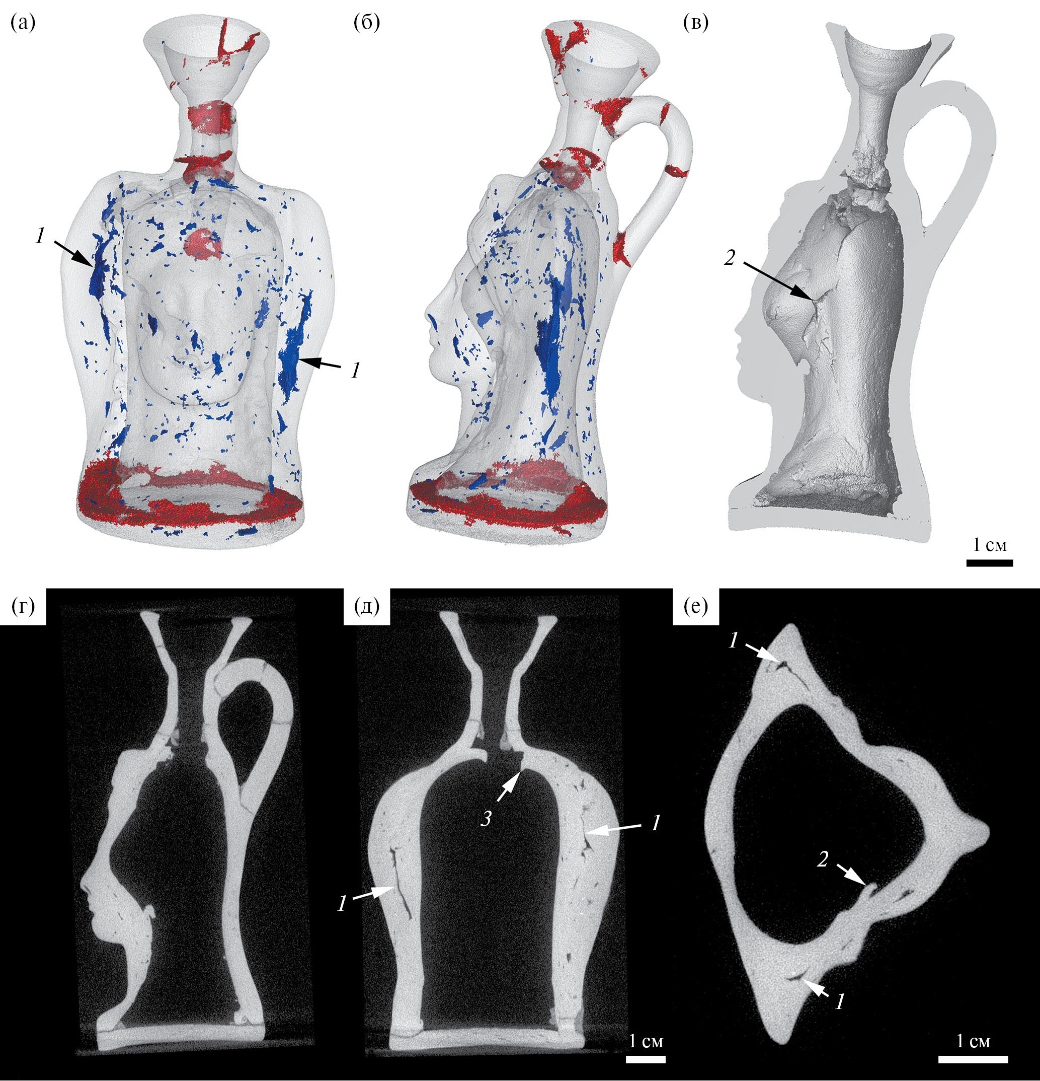 Рис. 2. Результаты рентгеновской томографии лекифа с фигурным изображением головы: а, б – модель расположения полостей и трещин в стенках предмета, красным цветом обозначены трещины и места склеек фрагментов сосуда, синим – полости между неплотно прижатыми частями керамики; в – модель внутренней поверхности правой стороны лекифа; г–е – томографические сечения: г – продольное, близкое к центральному, д – продольное, проходящее через крылья, е – поперечное, проходящее через центр тулова; 1 – полости между неплотно прижатыми частями керамики, 2 – выступы материала в зонах наложения деталей конструкции, 3 – загиб материала вокруг отверстия в верхней части тулова.