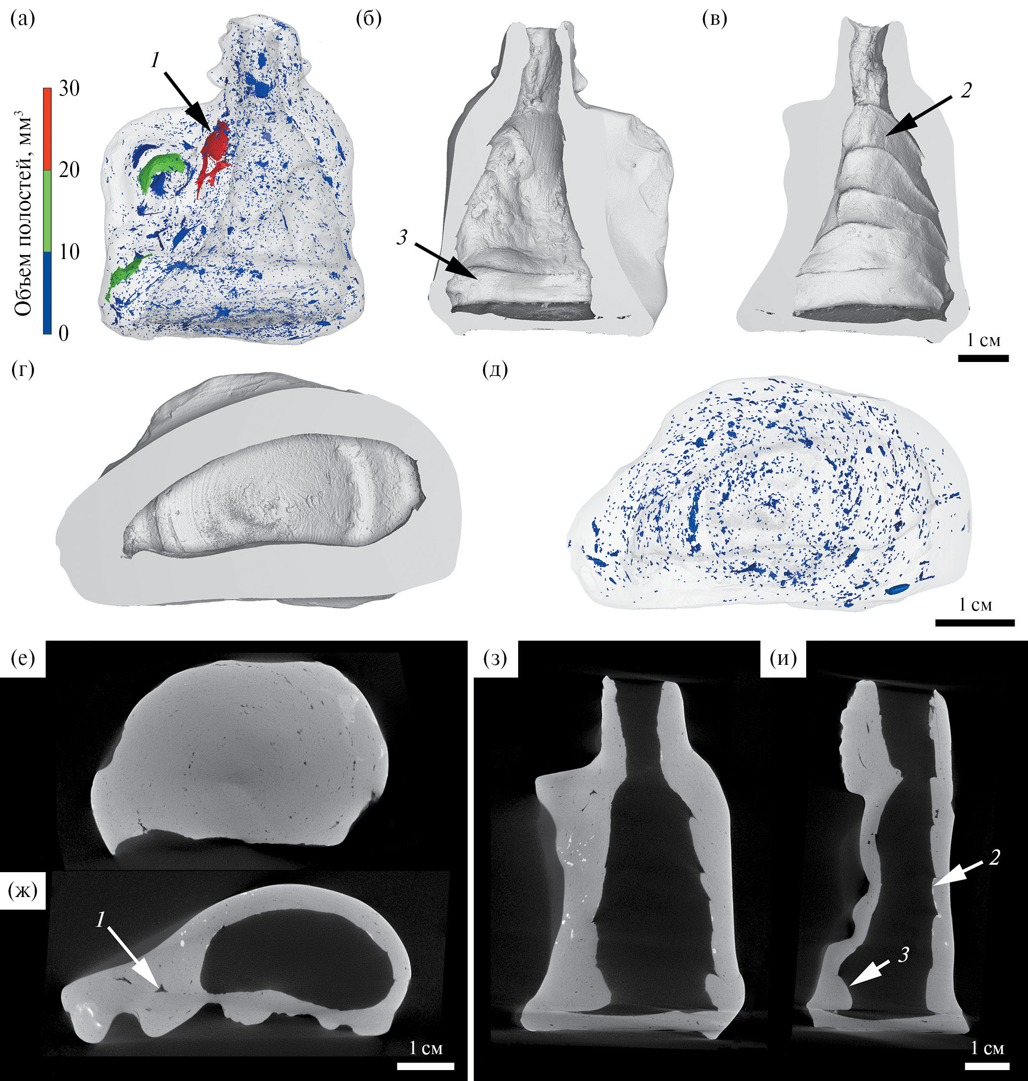 Рис. 4. Результаты рентгеновской томографии сосуда в виде сидящего мальчика с собачкой: а – модель расположения полостей в стенках сосуда; б – модель внутренней поверхности лицевой стороны; в – модель внутренней поверхности оборотной стороны; г – модель внутренней поверхности дна; д – расположение полостей внутри материала дна; е – продольное томографическое сечение, проходящее через дно сосуда; ж–и – томографические сечения, проходящие через центр тулова в трех взаимно перпендикулярных плоскостях; 1 – полости между неплотно прижатыми частями керамики, 2 – валики, образовавшиеся при изготовлении оборотной стороны тулова, 3 – жгут керамического теста в основании постамента.