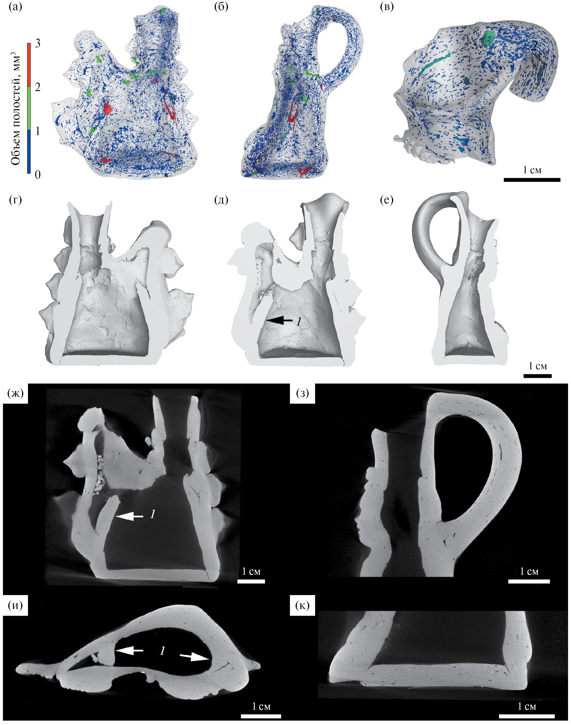 Рис. 3. Результаты рентгеновской томографии ойнохои в виде сидящего ребенка, дразнящего петуха: а–в – модель расположения полостей в стенках сосуда; г – модель внутренней поверхности лицевой стороны; д – модель внутренней поверхности оборотной стороны; е – модель внутренней поверхности левой стороны; ж – продольное томографическое сечение, проходящее близко к центру сосуда; з – продольное томографическое сечение горловины и ручки; и – поперечное томографическое сечение, проходящие близко к центру тулова; к – поперечное томографическое сечение дна; 1 – дополнительные фрагменты керамического теста, закрывающие боковые швы.