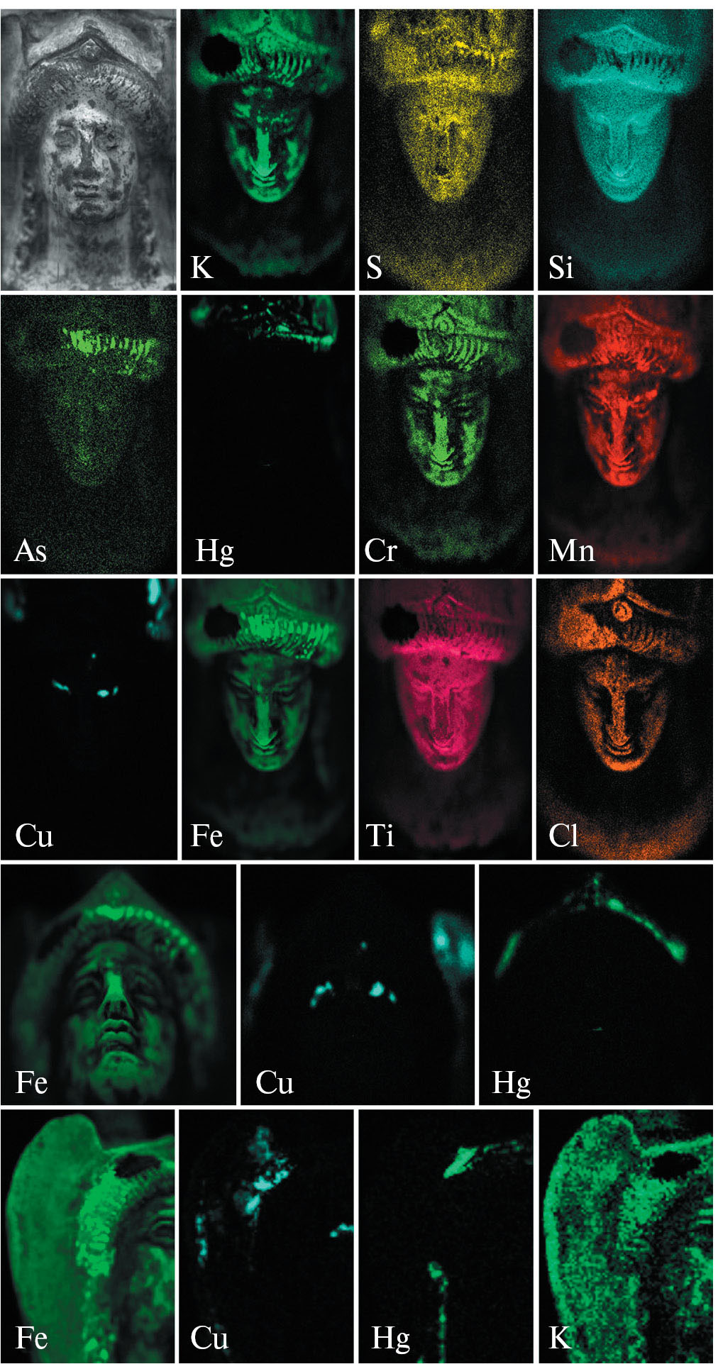 Из-за выраженного рельефа лекифа РФлА-картирование было выполнено для трех положений сосуда относительно рентгеновского пучка (рис. 5): пучок падал сверху относительно формы лекифа (со стороны лба к носу); снизу (от основания к голове), чтобы уточнить роспись лица. Для выявления росписи крыльев было выполнено картирование боковой части сосуда. Геометрия карт отличается от оптического изображения из-за того, что рентгеновский пучок падает на образец под небольшим углом. Установлено, что вся поверхность сосуда имеет достаточно высокое содержание калия и серы, на крыльях лекифа и в области глаз наблюдается повышенное содержание меди. В области волос зарегистрировано увеличение концентрации железа, особенно в углублениях рельефа, и повышение содержания мышьяка в правой части прически. В областях, сохранивших следы красной краски, – зона на головном уборе, углубление линии губ и у кромки линии волос на крыльях – наблюдается повышенное содержание ртути, серы и железа (рис. 5).