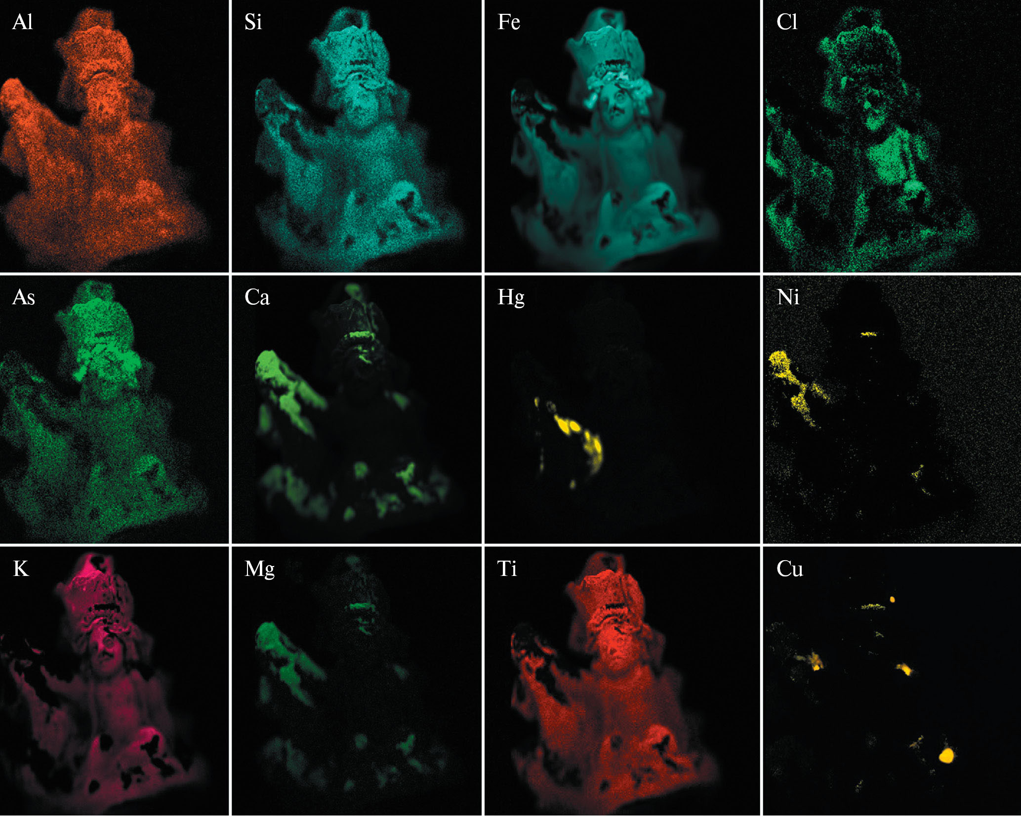 При РФлА-картировании ойнохои обнаружено наличие алюминия, кремния, железа и хлора на всей поверхности сосуда. В области волос ребенка выявлены следы мышьяка, повышенное содержание железа и кальция. На поверхности птицы наблюдаются следы ртути и никеля (рис. 6).