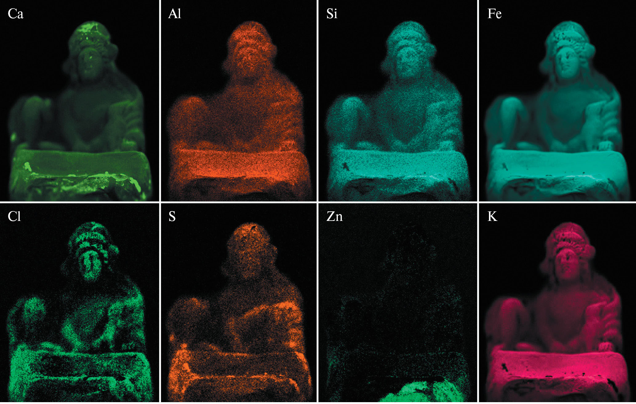 Картирование поверхности сосуда в виде сидящего мальчика с собачкой показало, что по всей поверхности сосуда наблюдаются кальций, алюминий, кремний и железо. В областях лица и волос повышено содержание хлора и серы и фрагментарно кальция. На поверхности основания сосуда увеличивается концентрация цинка (рис. 7). Но в целом карты показывают достаточно равномерное распределение большинства элементов, что свидетельствует или о крайне плохой сохранности росписи, или даже ее отсутствии на исходном сосуде.