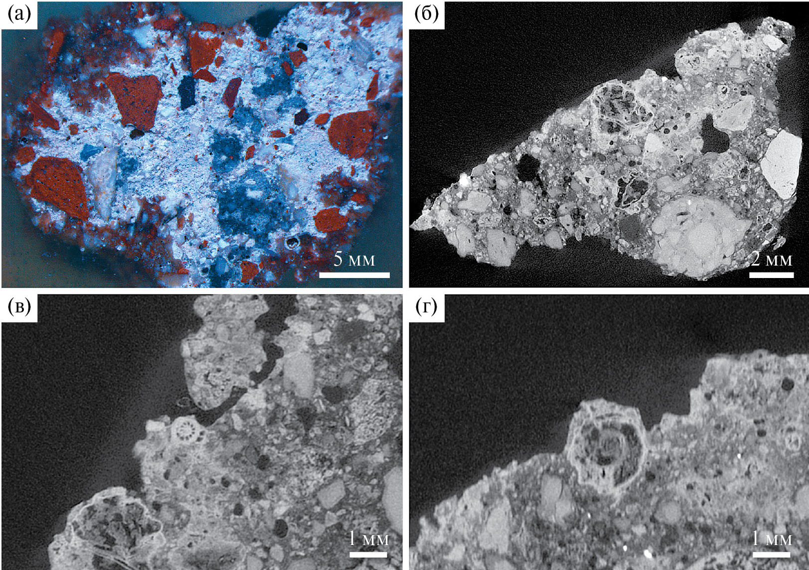 Исследование шлифов образцов из Эски-Кермена методом оптической микроскопии выявило, что из примесей в них преобладает битая керамика, присутствуют мелкие минералы (рис. 4a). Основная масса раствора имеет светло-кремовый цвет.