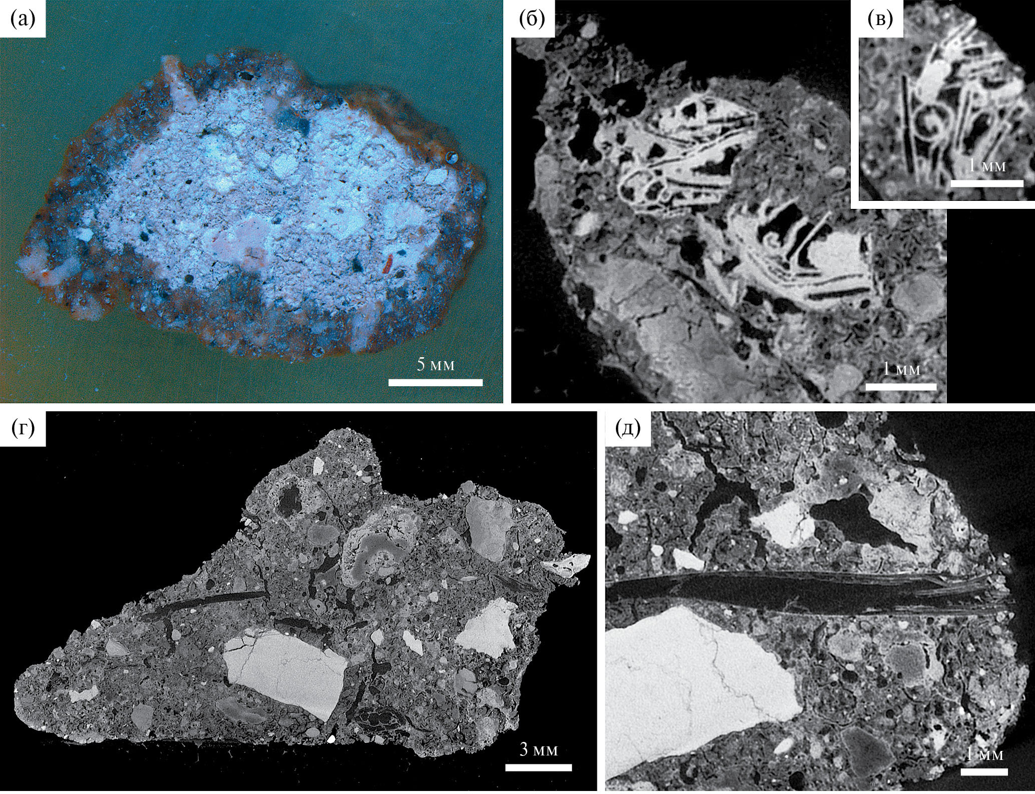 Включения органического происхождения присутствуют во всех образцах. В образцах Г46.4 (рис. 5в) и Г46.7 (рис. 5е, 5ж) наблюдаются единичные органические включения (раковины) размерами до 2 мм. В Г46.3 органические включения представляют собой полые трубочки (и их фрагменты) сечением ~1 × 2 мм с толщиной стенки ~300 мкм, вероятно, растительного происхождения (рис. 6д). В образце Г46.8 наблюдаются оба вида органических включений (раковины до 1.5 мм длиной и фрагменты трубочек). Целые раковины практически отсутствуют, сохранившиеся фрагменты распределены по объему в виде конгломератов (рис. 6б, 6в).
