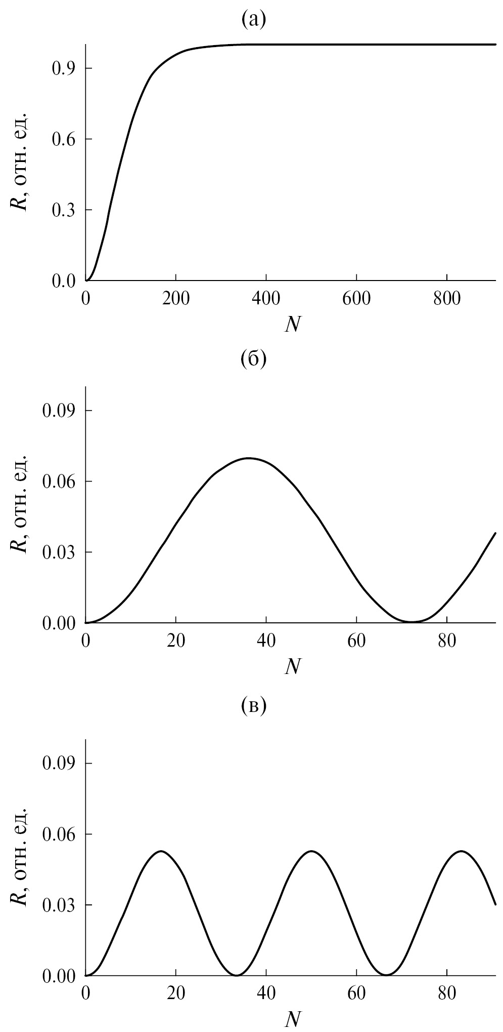 Рис. 3. График зависимости R(N) при трех значениях энергии пучка: а – значение энергии лежит в запрещенной зоне, б, в – в разрешенной зоне.