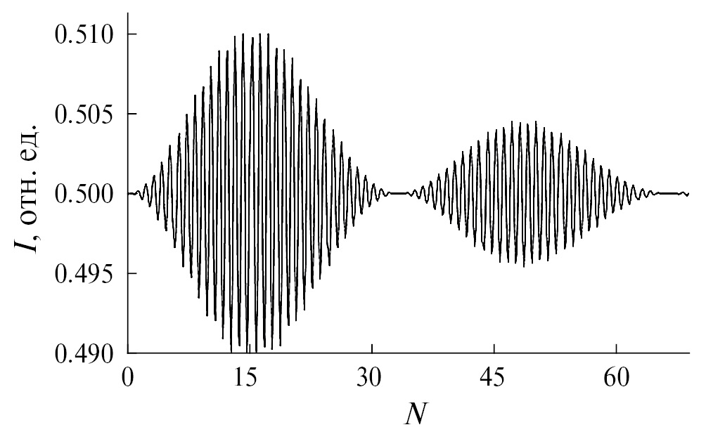 Рис. 5. Коротковолновые осцилляции, модулированные длинноволновыми колебаниями, с учетом ослабления интенсивности пучка.