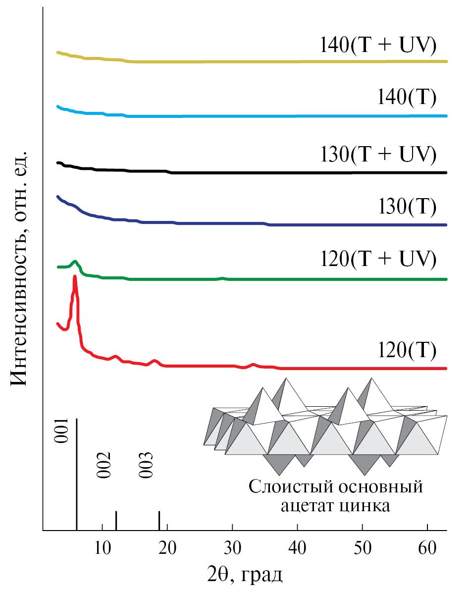 На рис. 1 представлены дифрактограммы всех серий образцов. На дифрактограмме образца 120(Т) можно четко идентифицировать три рефлекса 001, 002 и 003 при 2θ = 6.0°, 12.2° и 18.2° соответственно. Эти рефлексы соответствуют слоистому основныму ацетату цинка (Layered Basic Zinc Acetate – LBZA, Zn5(CH3COO)8(OH)2 · 2H2O) [20]. LBZA – промежуточный продукт перехода ацетата цинка в оксид в растворах. В процессе созревания золя происходит замещение ацетатных групп группами OH, а всю схему превращений в ZnO обычно представляют в упрощенном виде [21]:
