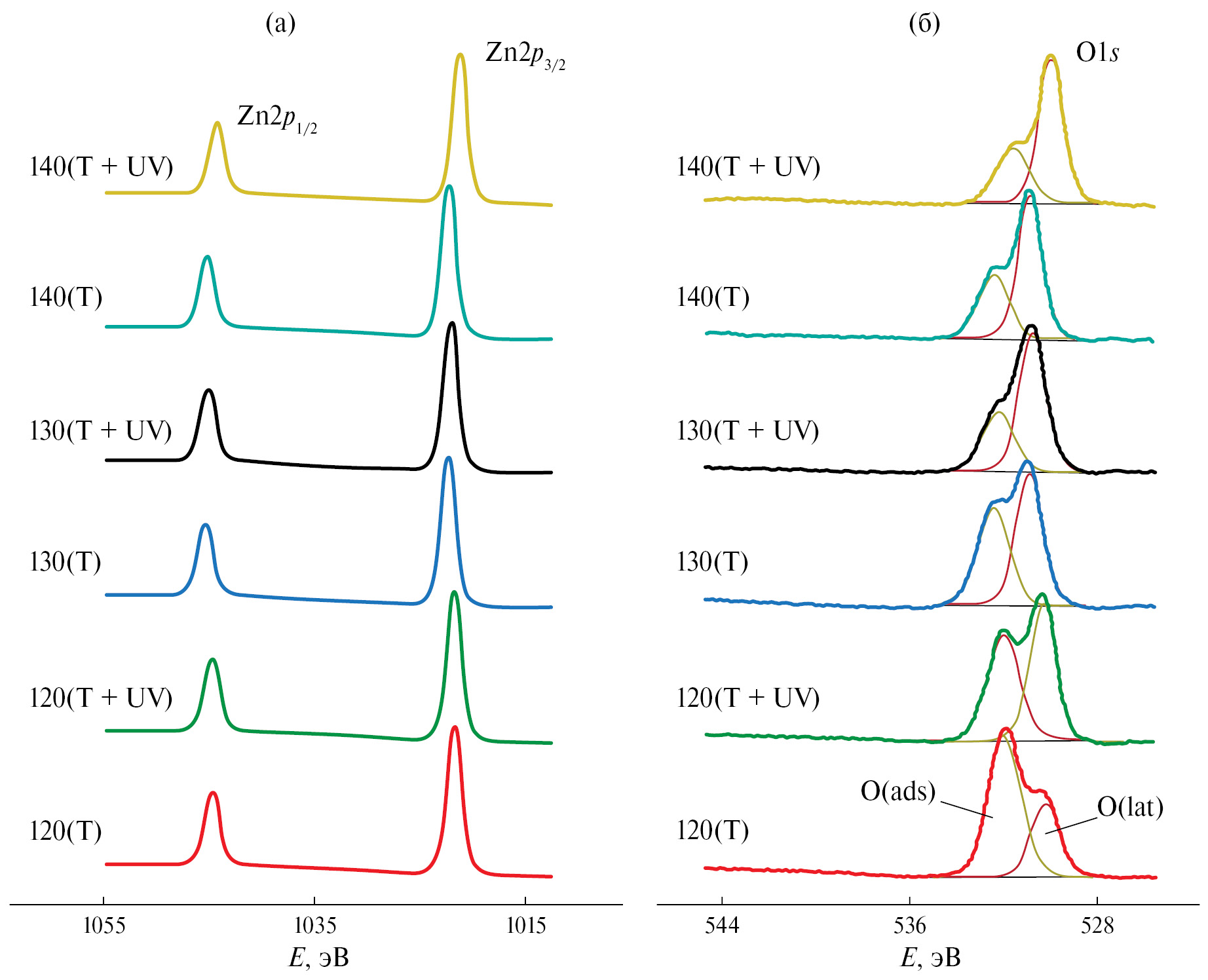 Для оценки соотношения аморфных фаз оксида и гидроксида цинка рассмотрим изменение соотношения форм O(lat) и O(ads) при различных режимах обработок. В табл. 1 приведен параметр , характеризующий долю кислорода в образце, занимающего позицию в решетке ZnO. С ростом температуры отжига от 120 до 140°С она возрастает от 0.3 до 0.63. Комбинированная обработка при тех же условиях демонстрирует вклад, зависящий от температуры: при 120°С она увеличивает долю от 30 до 50%, при 130°С – от 50 до 65%, при 140°С не показывает практически никакого отличия от простой термической обработки. Исходя из соотношения в чистом ZnO, зная величину O(lat), можно рассчитать долю катионов цинка, входящих в состав нанокристаллов оксида: в табл. 1 приведено соотношение . Видно, что при температуре отжига 120°С 29% катионов цинка входит в состав связей Zn–O–Zn в частицах. Тем не менее размер этих частиц мал, в связи с чем на дифрактограмме отсутствуют рефлексы фазы ZnO, а пленки не демонстрируют полупроводниковых оптических свойств. Комбинированная обработка при той же температуре позволяет увеличить долю до 39%. При температуре 130°С комбинированная обработка повышает долю от 41 до 44% по сравнению с термической обработкой, у образца появляются полупроводниковые свойства и оптическая щель шириной 3.32 эВ. Наконец, при температуре 140°С комбинированная обработка не оказывает никакого влияния на соотношение: = 0.45 в обоих случаях, а спектры поглощения носят полупроводниковый характер и практически идентичны.