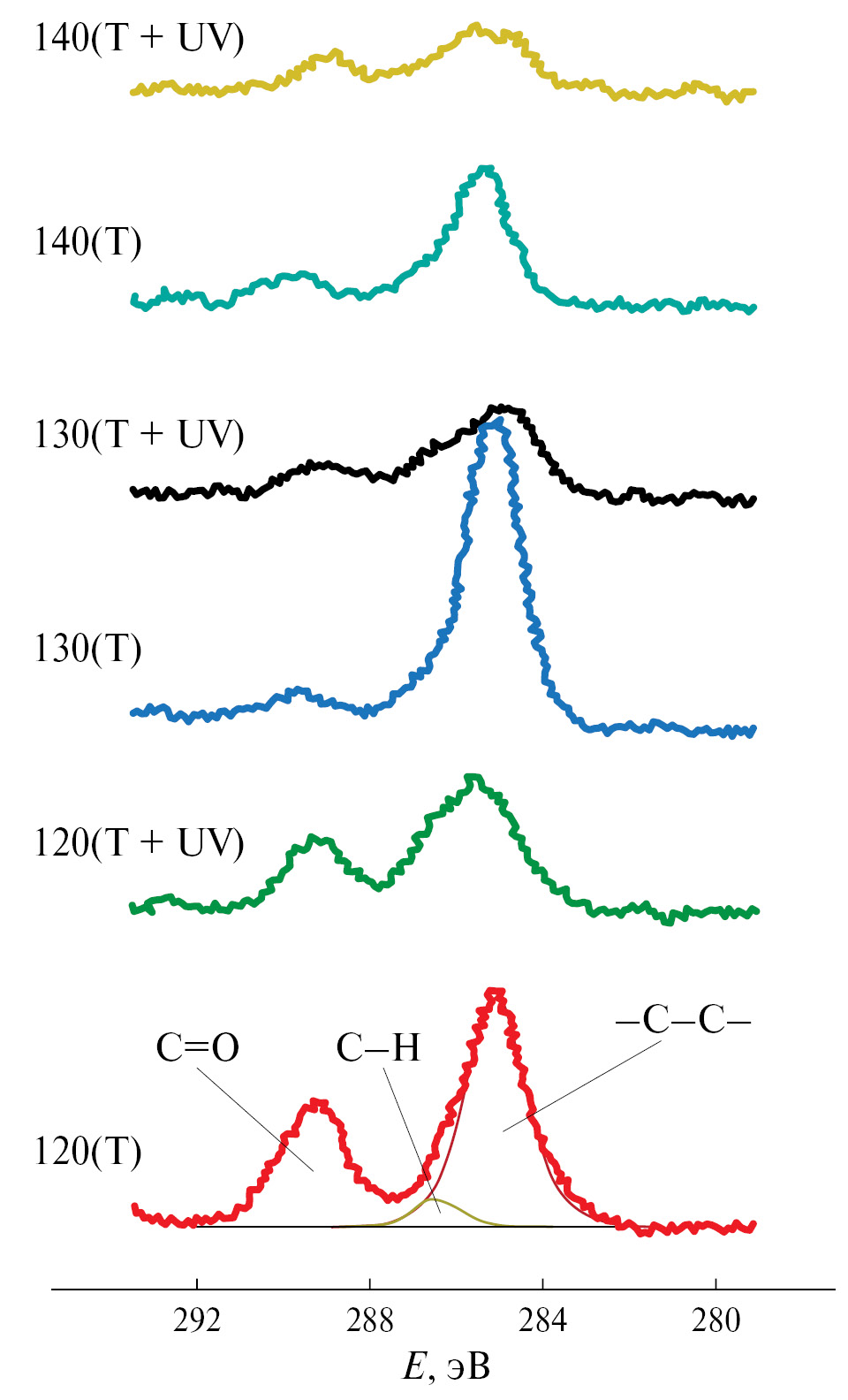 Анализ спектров рис. 4 показывает, что образцы 120(T) и 120(T+UV) содержат значительную долю атомов углерода, входящих в карбонильную группу (34 и 27% от общего углерода в пленках соответственно). Однако уже в образце 130(T) наблюдается значительное ее сокращение и накопление углерода на поверхности в форме С–С–С–. Вероятно, это связано с удалением ацетат-ионов из пленки и их трансформацией в аморфный углерод (сажу). В табл. 1 также представлен параметр . Для образцов 130(T+UV), 140(T) и 140(T+UV) его значение составляет всего 5%, что говорит о практически полном удалении ацетатных групп из пленки. Этот факт коррелирует с исчезновением на дифрактограммах тех же образцов рефлексов фазы LBZA и появлением межзонного оптического поглощения, характерного для прямозонного полупроводника. Таким образом, можно заключить, что пленки 130(T+UV), 140(T) и 140(T+UV) представляют собой систему аморфных оксида и гидроксида цинка с разным соотношением фаз.