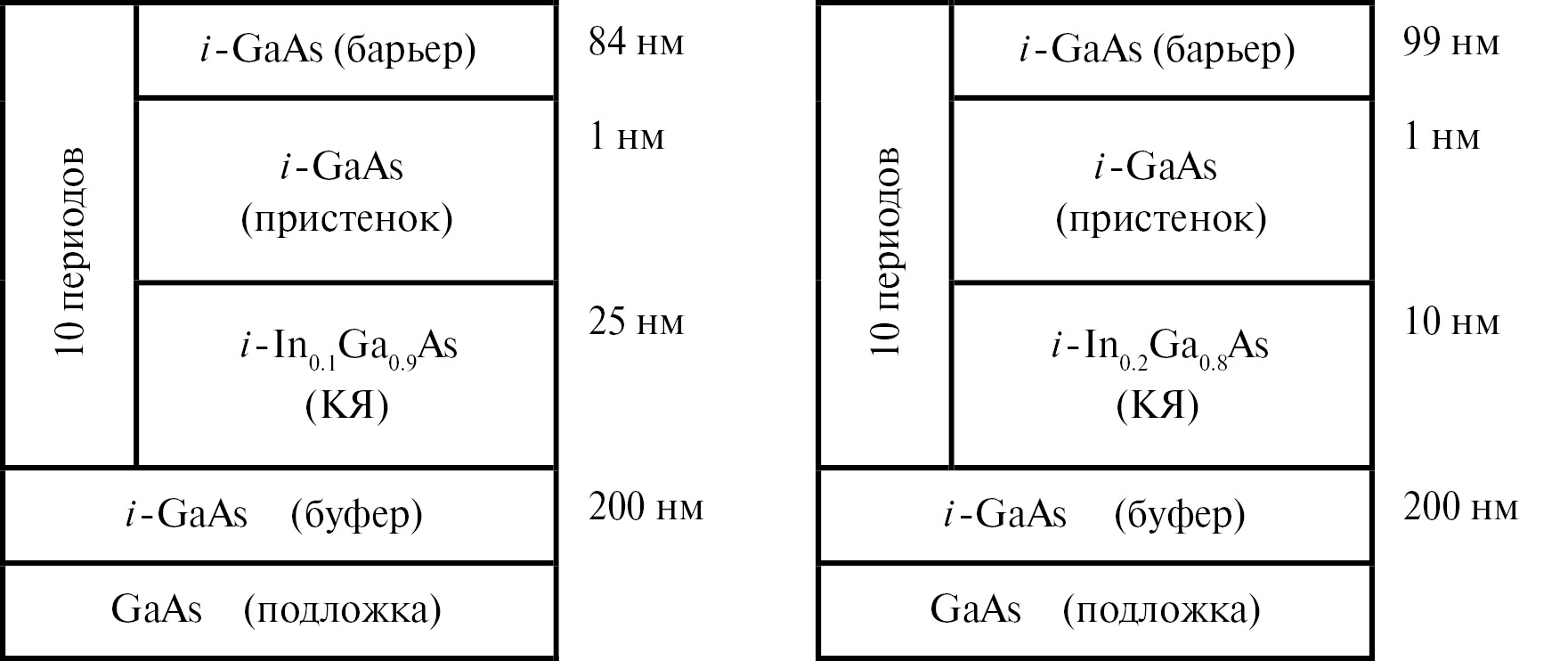 Слой | {In0.1Ga0.9As/GaAs}×10 | {In0.2Ga0.8As/GaAs}×10 | ||||