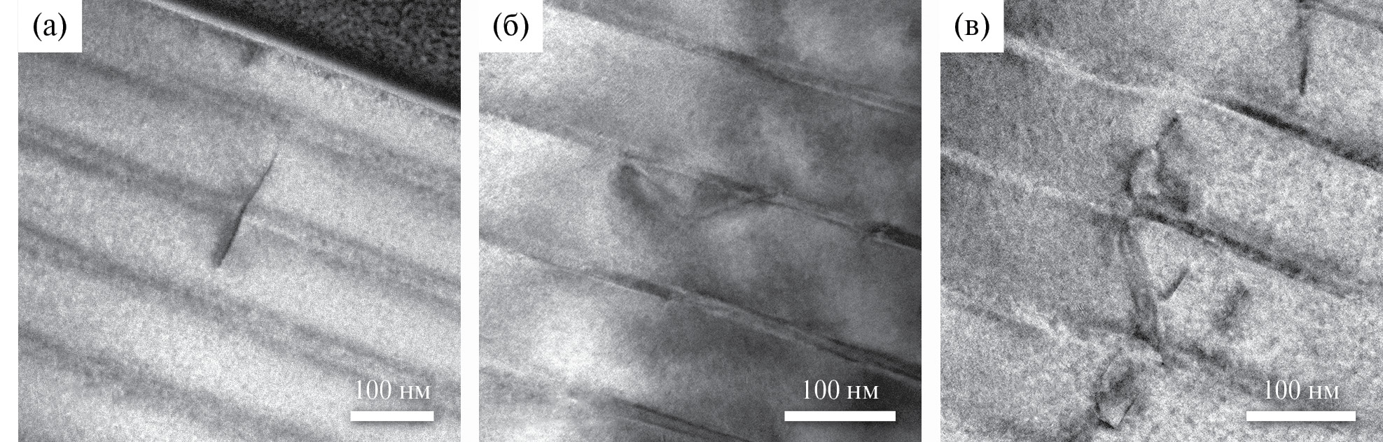 Рис. 4. Светлопольные ПЭМ-изображения дислокаций в образцах: а – 106 (100), б – 102 (110), в – 102 (111)А.
