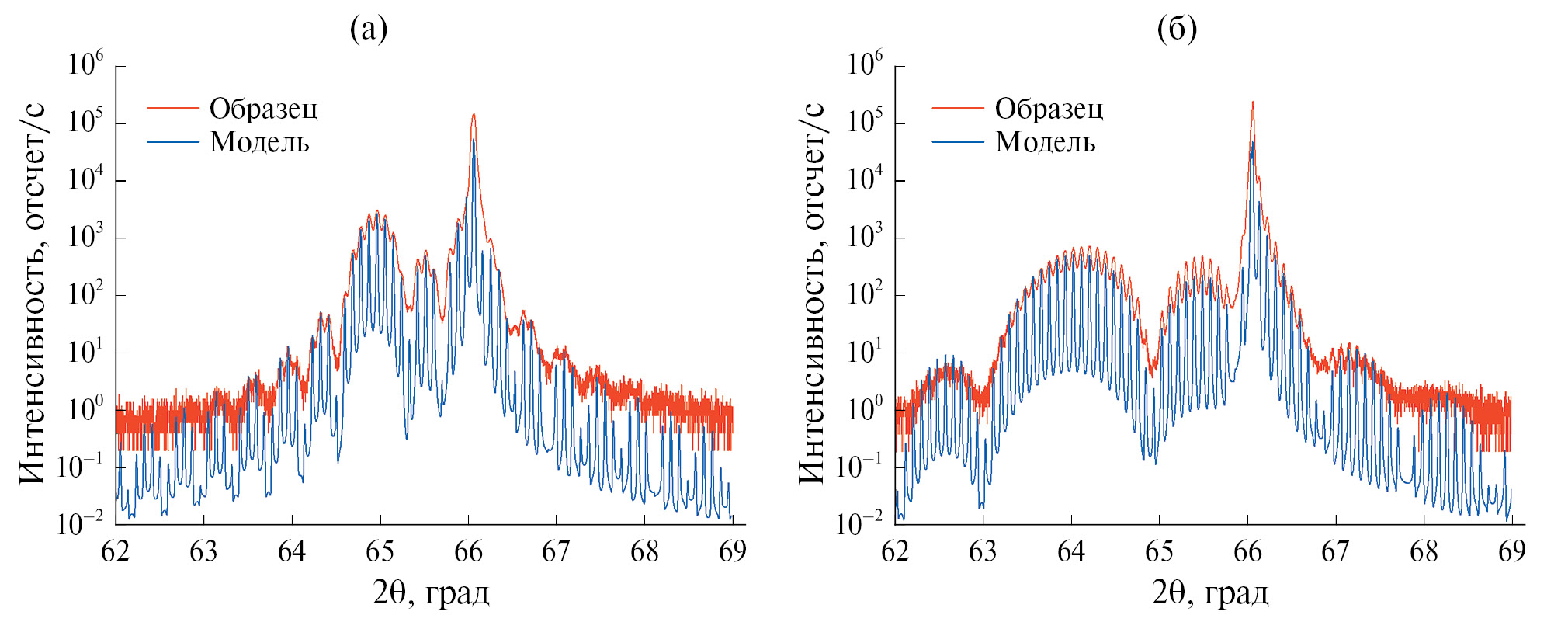 Рис. 5. КДО 004 образцов 105 (а) и 106 (б) на подложках GaAs(100).