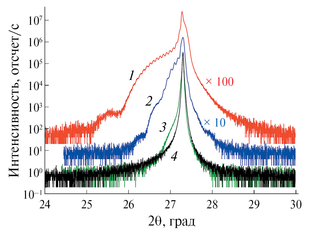 Кривые дифракционного отражения (КДО) измеряли на дифрактометре Ultima IV (Rigaku), излучение CuKα (30 кВ, 30 мА, λ = 1.54056 Å), кристалл-монохроматор Ge(220)×2, параллельный пучок, вертикальная щель DHL 2 мм, горизонтальные щели DS–RS/SS 0.2–0.5/0.5 мм, шаг 0.002°, время счета 5 с.