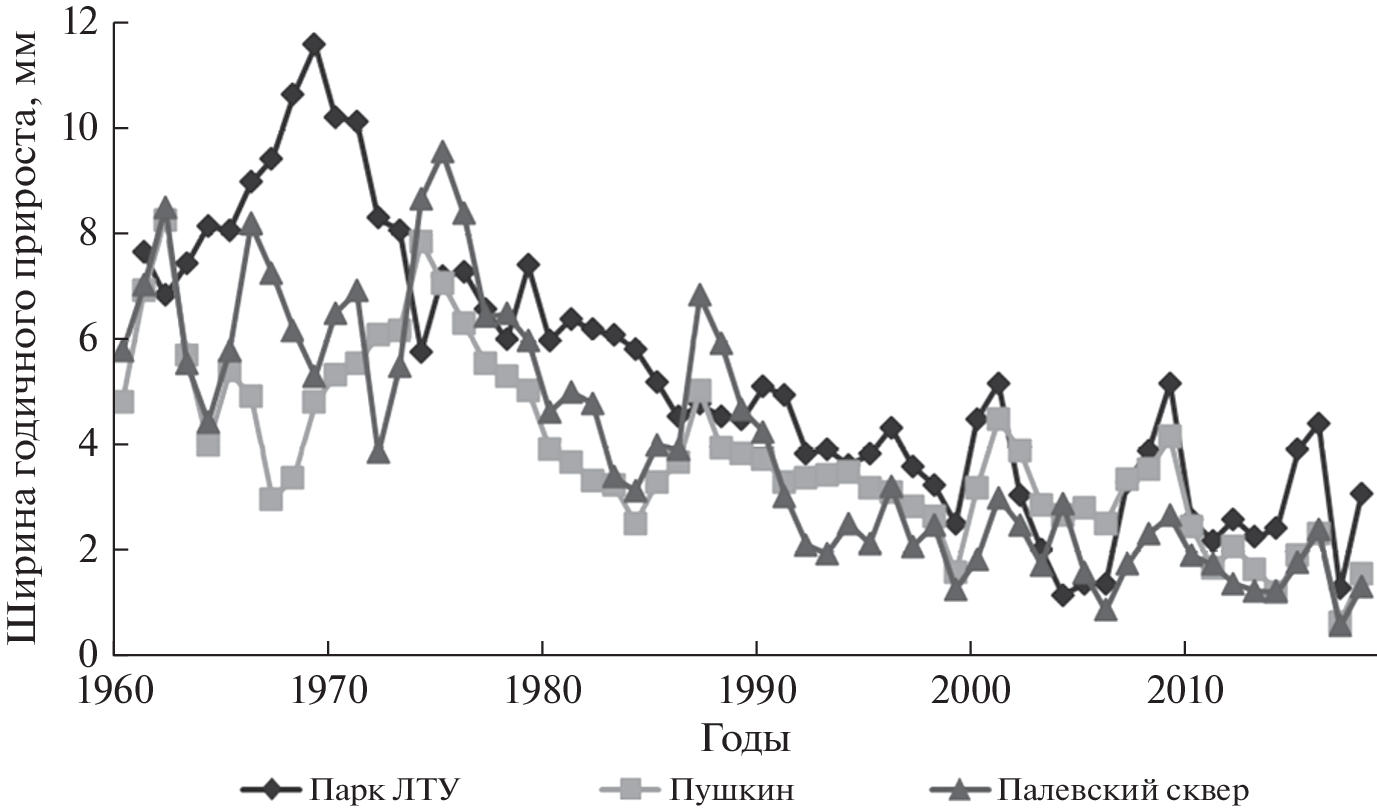 The effect of temperature and precipitation on the change in the radial growth of wood of Berlin poplar (Populus × berolinensis Dipp.) and small-leaved linden (Tilia cordata Mill.) in Saint Petersburg was studied. Cores were taken from old trees in the Forestry Technical University park, in the Palevsky square, in the city of Pushkin (poplar trees) and in the Moscow Victory Park (linden trees). To eliminate the influence of the samples’ age factor on the change in its growth rings’ width, the generally accepted detrending methods were used; the calculations were carried out in the Arstan software. Precipitation and temperature fluctuations during the winter period do not significantly affect the growth of poplar and linden in Saint Petersburg. Summer precipitation has a positive, but overall not a decisive effect, in some cases, the radial growth increases with increasing rainfall. Temperature has no significant effect on standardised (age-adjusted) growth rates. Non-standardised average values of growth under the increasing temperature conditions in July–September significantly decrease. The effects of temperature and precipitation appear to be indirect, exacerbating or offsetting the effects of other factors, especially the air pollution. The impact of pollutants increases with the increase in temperatures at the end of the growing season, because they accumulate on the leaves’ surface. Precipitation washes away pollutants, reducing the intensity of their impact. Growth decline in poplar trees in the second half of the 1990s, in the absence of such an occurrence in linden, can be explained by the consequences of a prolonged outbreak of the poplar moth (Phyllonorycter populifoliella) mass reproduction in 1991–1999. The above assumptions require additional research; in particular, determining the level of leaf contamination during the growing season and taking into account the impact of other factors.