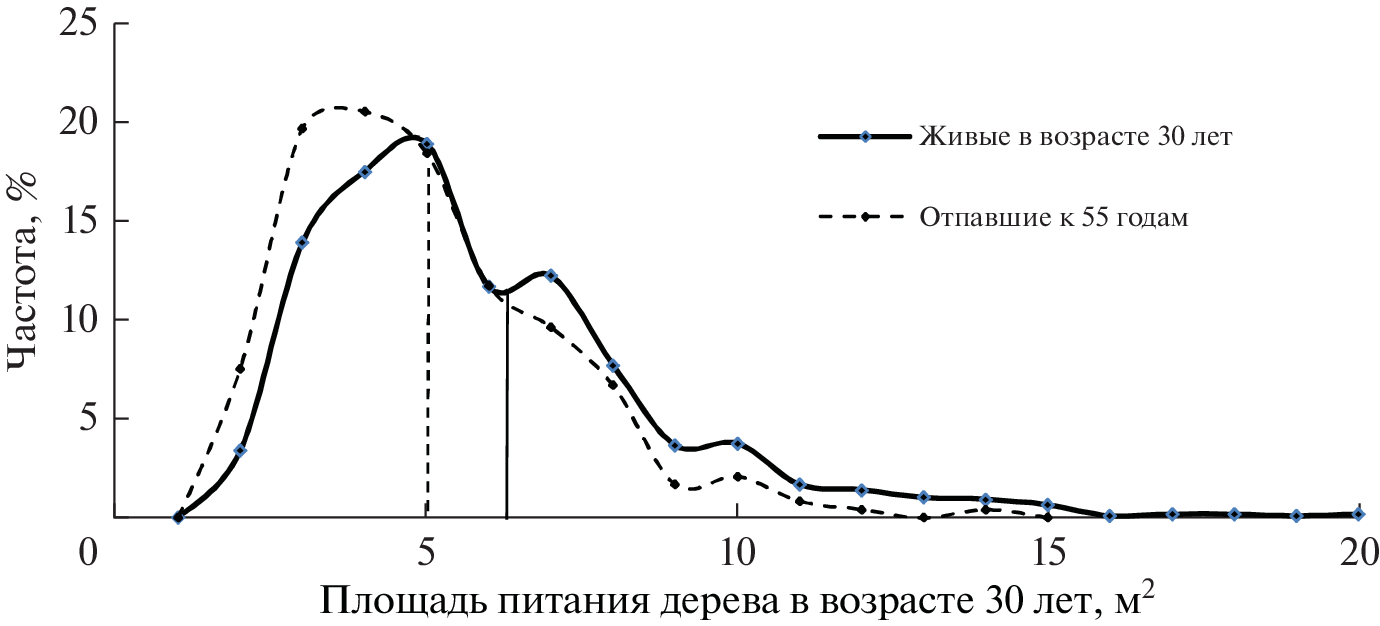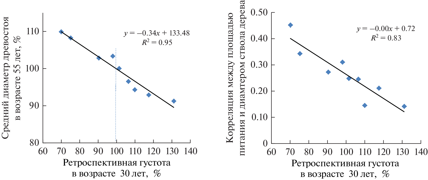 Pine plantations of class 1B were studied, with a density of 0,95 on an area of 0,64 ha, created in a cleared area following the 1.82 × 1.10 m plan. Alive and dead trees and their feeding areas were plotted on the plan in the ArcMap-ArcView programme. The territory was divided into 9 sections, with a density of 76–122% of the average for the plantation. The feeding area the trees had at the age of 30 years affected the trunk diameter at 55 years in sparse areas of the stand on average by 13.3%, and in denser areas by 5.0%. That confirmed the hypothesis that the influence of the tree feeding area on the trunk diameter can also be weak in the middle-aged stands, and the magnitude of its influence depends on the density of the stand. Tree mortality by the age of 55 correlated with the frequency in feeding area classes (r = 0.96 ± 0.03), thus the feeding area being less than the average value increased the probability of a tree falling off by the age of 55 by only 7%. It has been suggested that the decrease in the affect the feeding area has at high density is due to the increased cooperation of trees. With simulated thinning of the stands, with an increase in the feeding area of the remaining trees by 2 times, a corresponding increase in diameter was obtained only in 11% of the trees. The remaining 89% of the trees did not take advantage of the larger feeding area and did not increase in size, despite 25 years of development with a sparser standing. This indicates that in plantations of the second age class, an increase in the feeding area no longer leads to an improvement in their development in the vast majority of cases. Therefore, the density should be reduced at a much earlier age, for example, at 10–15 years.