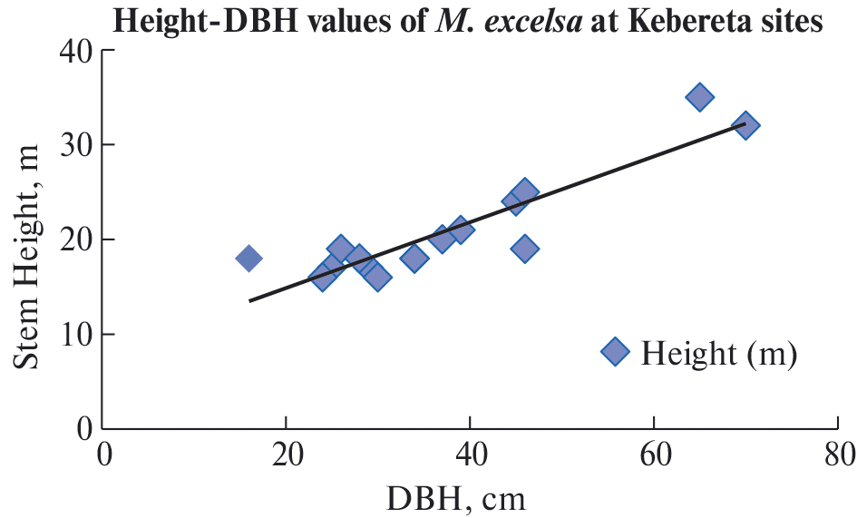 Fig. 5. The linear trend line of height-DBH values of M. excelsa at the Kebereta site.