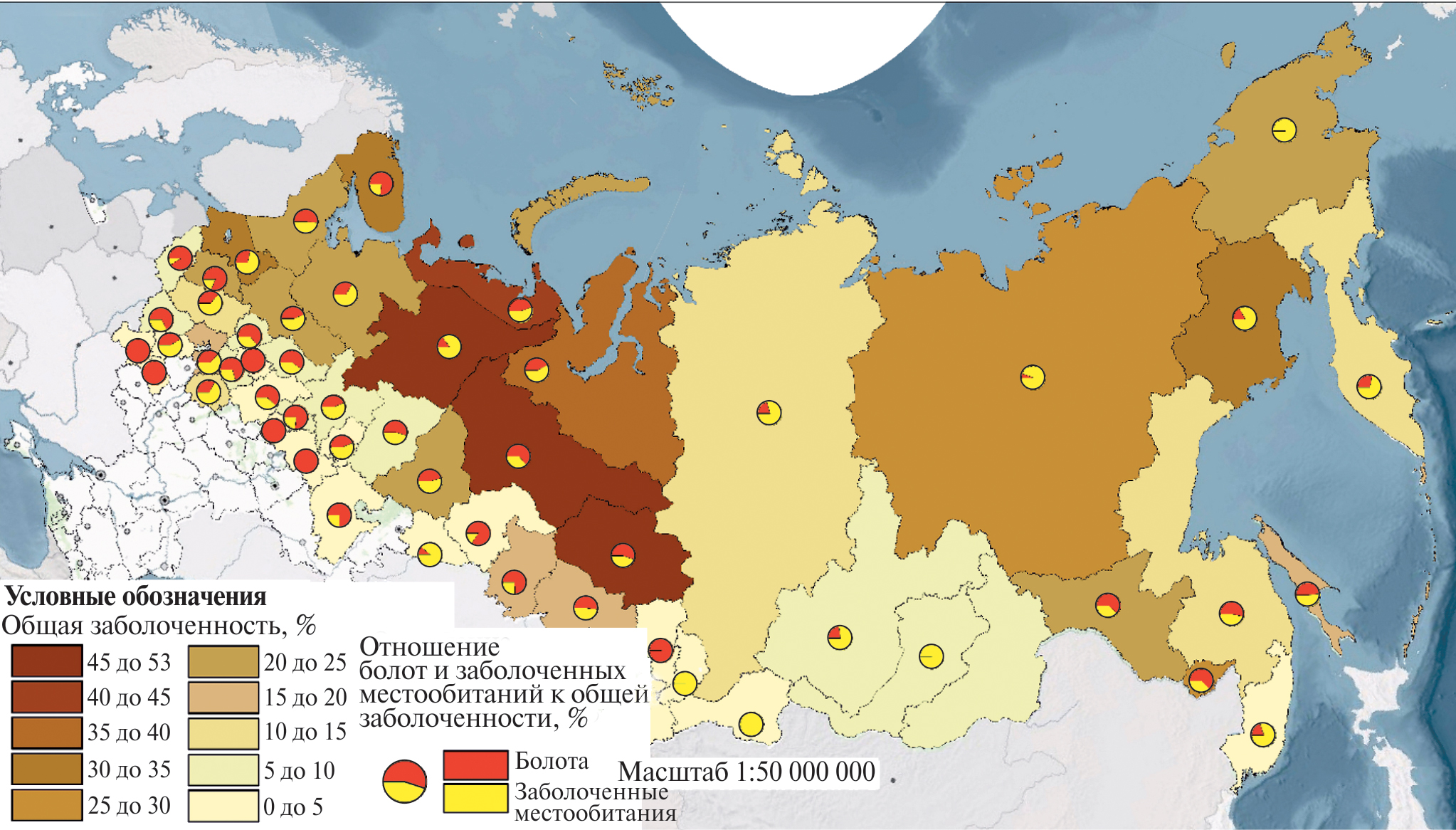 Заболоченность районов Европейского Севера или Западной Сибири может достигать 40% и более (Торфяные болота…, 2001). В европейской части России болота покрывают около 6% территории (~23 млн га), а вместе с мелко-оторфованными землями 17.5% (~68 млн. га) (Sirin et al., 2017). Заболоченность Российской Арктики, включая болота и мелко-оторфованные земли, превышает 30% (Болота, 2019).
