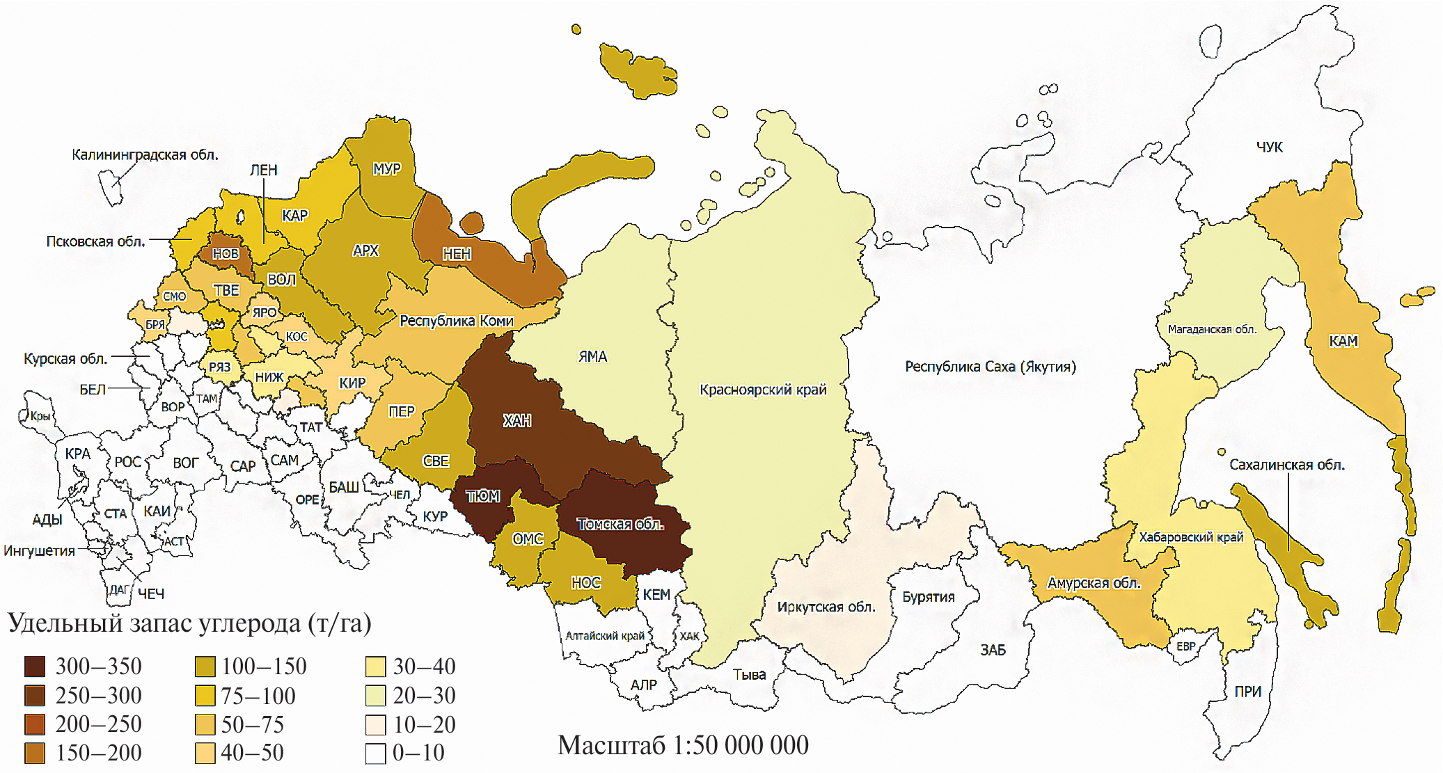 Основной вклад в запас углерода болот страны вносят верховые болота – 39% всего запаса углерода в торфах болот и заболоченных местообитаний, 20.5% – переходные болота и 7% – низинные. Более 12% запаса углерода в торфах болот содержится в мерзлых болотах – полигональных и бугристых. Среди заболоченных земель лидируют заболоченные таежные леса и редколесья (12%), тундра и лесотундра (8.6%) и заболоченные поймы (0.5%). Абсолютные значения запасов углерода в торфах на всю страну (108.7 млрд т) и по субъектам РФ (Приложение) и относительные (331 т С га-1) на единицу суммарной площади болот и заболоченных местообитаний, визуализированных в виде серии соответствующих карт.