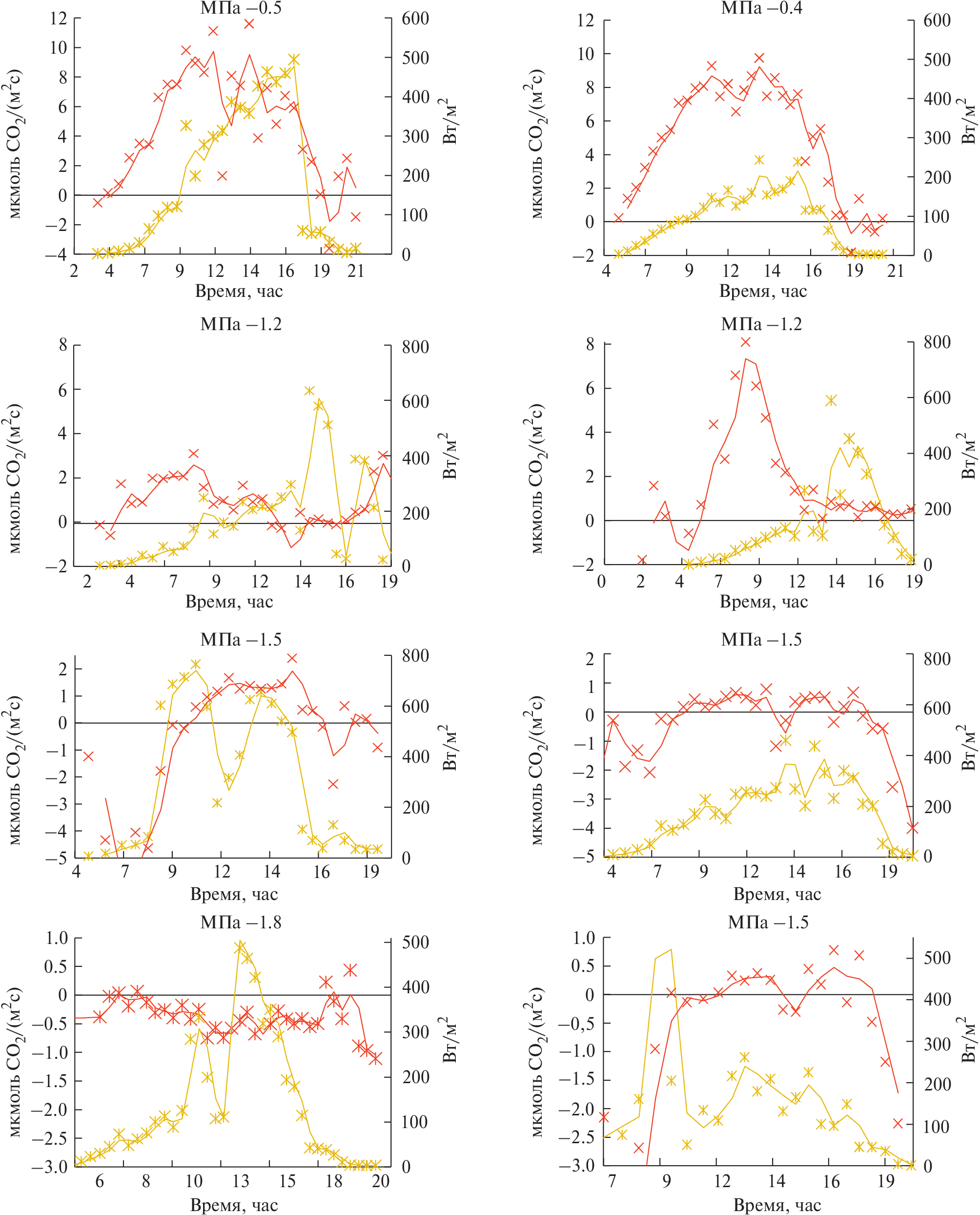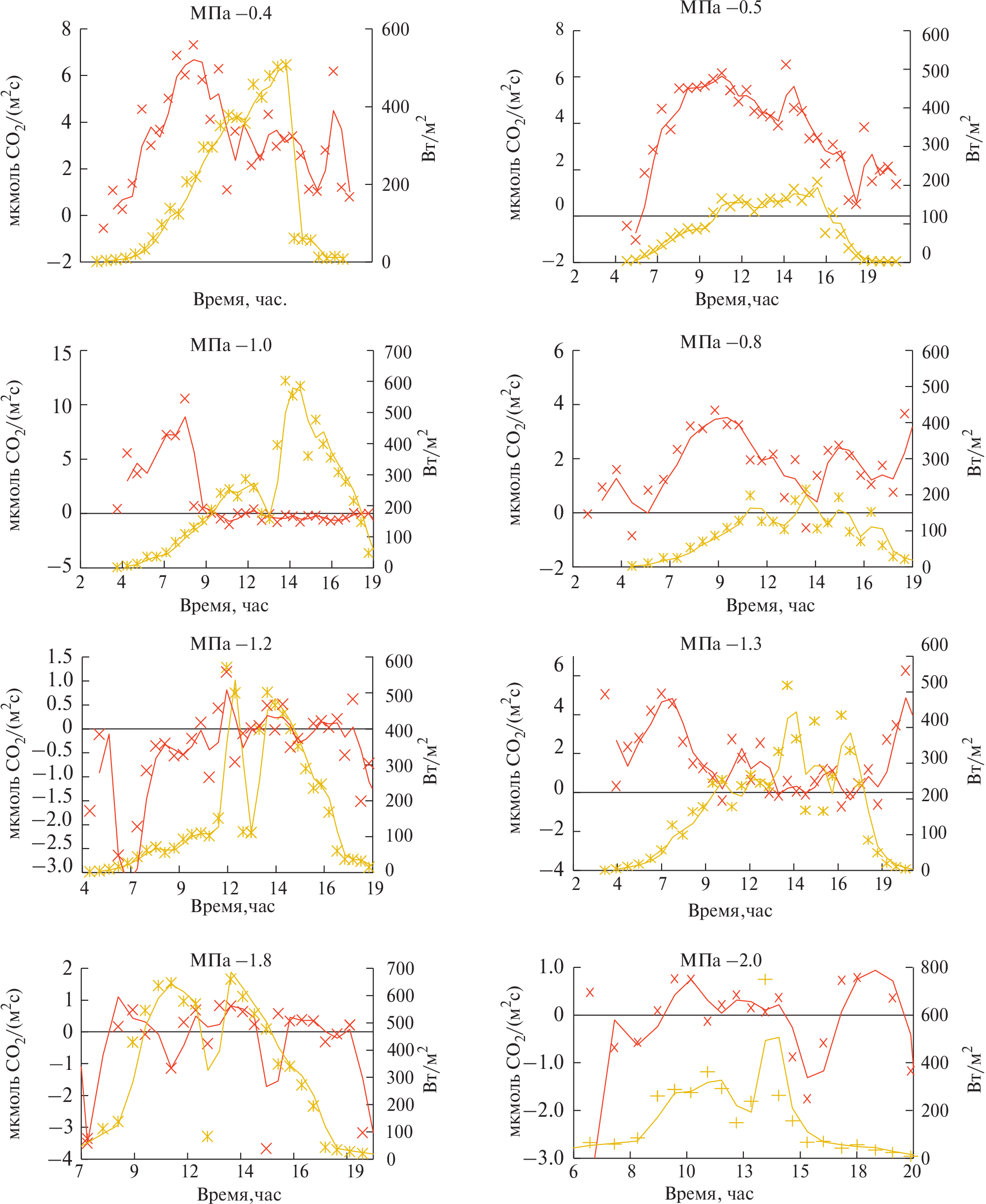 Рассмотрим, как изменяется интенсивность фотосинтеза ели в течение дня при разном недостатке водообеспечения, выражаемом величинами ПВП, в дни с переменной облачностью и в дни практически со сплошной облачностью (рис. 2). Видно, что при относительно достаточном водообеспечении (ПВП= –0.4 МПа), ель в малооблачный день имеет классический двугорбый ход фотосинтеза с провалом в полуденные часы, когда солнечная радиация становится выше 200 Вт м–2. В день со сплошной облачностью полуденного провала не наблюдается, но несмотря на то, что интенсивность солнечной радиации была ниже 200 Вт м–2, фотосинтез постепенно снижался.
