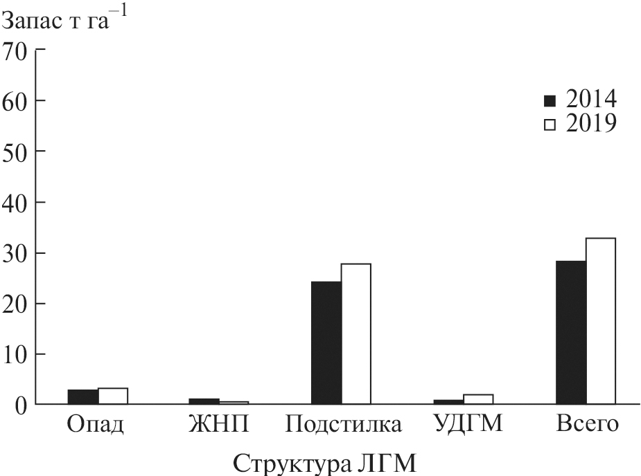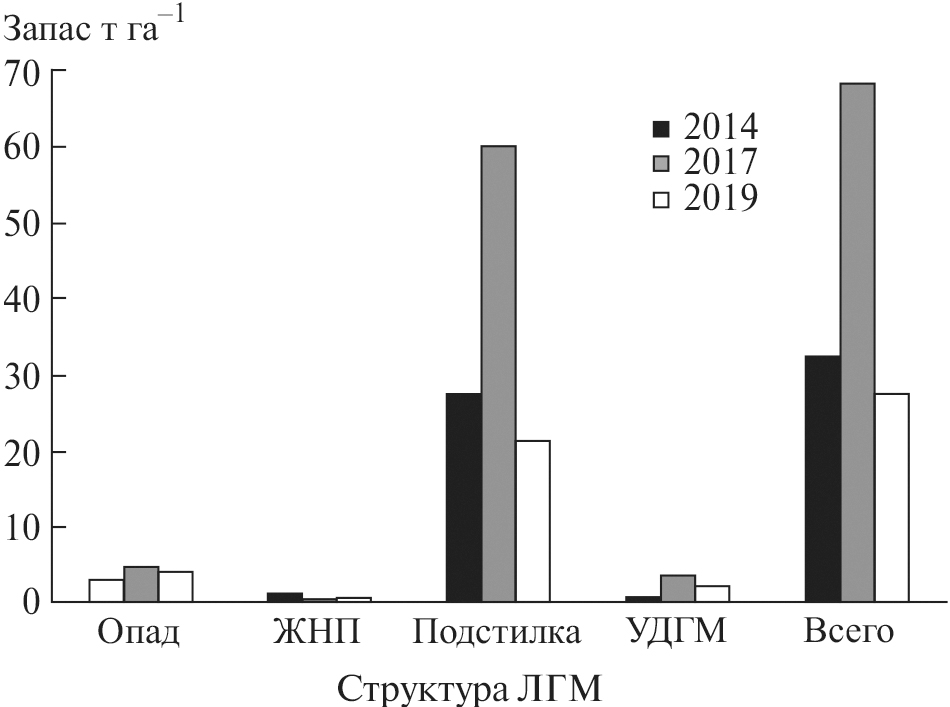 В течение 5 лет на ПП 2 проведено 2 контролируемых выжигания (2014 и 2017 гг.) с периодичностью в 3 года. Допожарный общий запас ЛГМ был равен 32.3 т га–1 (рис. 2). На лесную подстилку приходилось 27.4 ± 5.86 т га–1 (85% от общего запаса). Запас опада насчитывал 2.9 ± 0.72 т га–1, где основной вклад принадлежал хвое (38%) и шишкам (45%). Травяная ветошь и древесная кора составляли 3 и 14% соответственно. Запас ЖНП был равен 3.9% (1.3 ± 0.34 т га–1). На запас УДГМ приходилось 0.7 ± 0.09 т га–1 с наибольшей долей 1-го (56%) и 2-го классов диаметров (25%). УДГМ 3-го класса составили 19%. На запас проводников горения приходилось 31.5 т га-1.