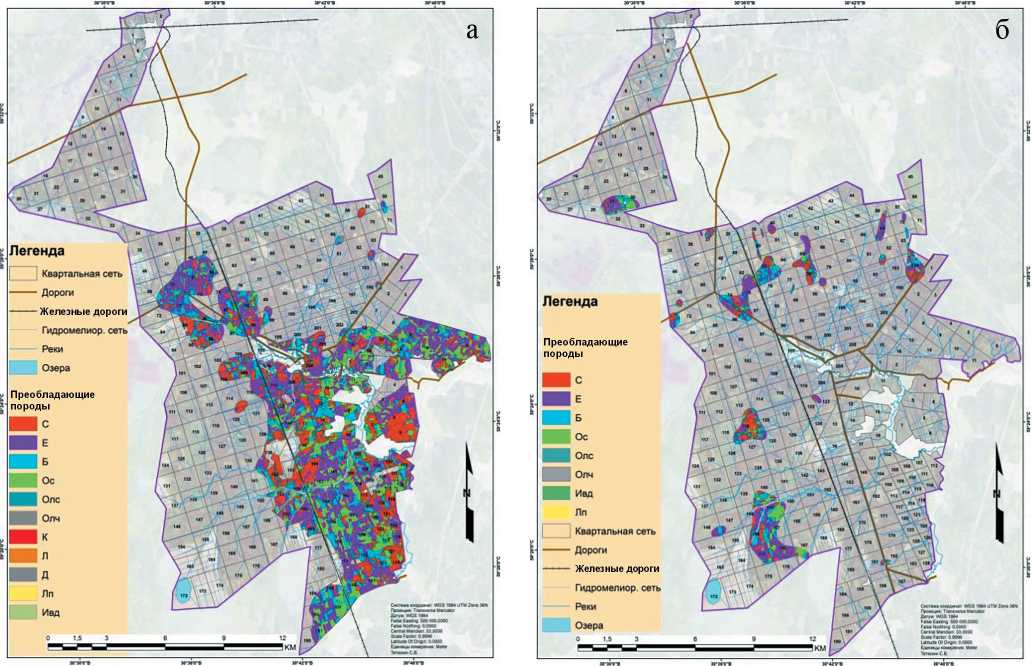 Рис. 1. Векторные карты пространственного расположения лесотаксационных выделов на ленточных глинах (а) и песках (б). Преобладающие породы: С — сосна, Е — ель, Б — береза, Ос — осина, Олс- ольха серая, Олч — ольха черная, К — кедр (лесные культуры), Л — лиственница (лесные культуры), Д — дуб, Лп — липа, Ивд — ивы древовидные.