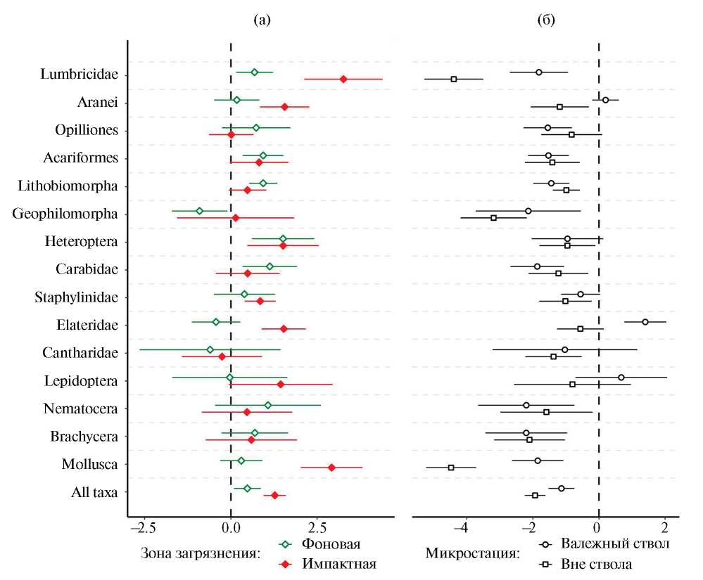 Плотность беспозвоночных рассчитывали с учетом объема разобранного фрагмента ствола и пересчитывали в экз./дм3. В этой же размерности выражена плотность макрофауны в стандартных почвенных монолитах (их глубина принята равной 25 см, т. е. объем монолита равен 10 дм3). Средний объем разобранных фрагментов стволов в фоновой зоне составил (среднее ± ошибка) 8.86±1.67 дм3, в импактной — 8.76±0.76 дм3 (различия статистически незначимы, t-критерий равен 0.06, p = 0.951). Обилие беспозвоночных в разных слоях (кора и древесина, подстилка и органоминеральный горизонт) суммировали в пределах каждой пробы. В общую плотность педобионтов не включили пустые коконы дождевых червей (чтобы избежать двойного учета этой группы), а также муравьев и имаго двукрылых (поскольку ручная выборка не позволяет корректно оценить численность этих групп).