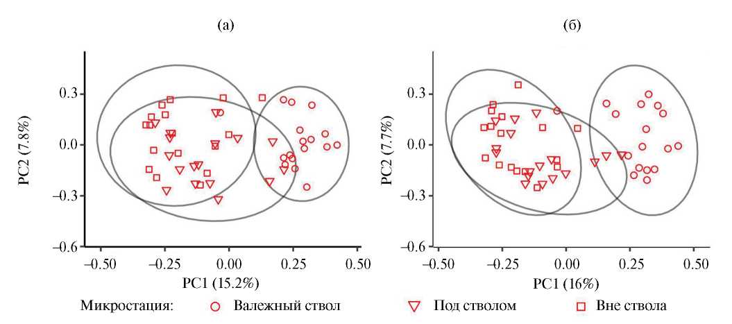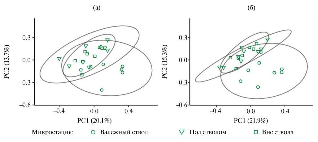 Разнообразие таксоценов характеризовали профилями Хилла (Chao et al., 2014), рассчитанными в пакете vegan v. 2.6. Ординацию микростаций проводили на основе расстояния Брея—Кёртиса по абсолютному обилию методом главных координат (PCoA) в пакете ape v. 5.7 (Paradis, Schliep, 2019). Использовали два варианта ординации — на уровне надвидовых таксонов и по видовому составу тех групп, где он был определен. Из-за наличия большого числа нулевых проб в импактной зоне ординация по видовому составу для отдельных таксоценов, особенно маловидовых, затруднительна. Поэтому во втором варианте использовали обобщенный массив видов по дождевым червям, моллюскам, паукообразным, литобиидам и геофилидам, жужелицам, щелкунам. В него также включили одновидовые таксоны (диплоподы, ряд семейств жесткокрылых (табл. 1)). Статистическую значимость различий группового и видового состава между зонами загрязнения и микростациями оценивали с помощью PERMANOVA (999 перестановок) в пакете vegan v. 2.6.