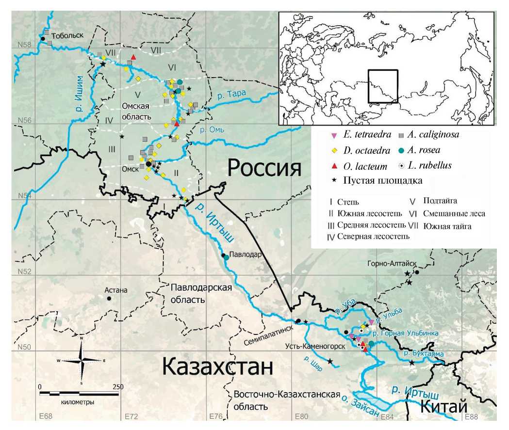Исследования были проведены в вегетационные сезоны 2018, 2022, 2023 гг. Район исследований располагался в Рудном Алтае и на юге Западно-Сибирской равнины. Самая южная точка находилась в окрестностях с. Жана-Ульга в Катон-Карагайском районе Казахстана (49°11.953'N, 85°46.616'E, 864 м над ур. м.), самая северная — в окрестностях г. Тобольска Тюменской области России (58°15'24″N, 68°17'25″E, 90 м над ур. м.).