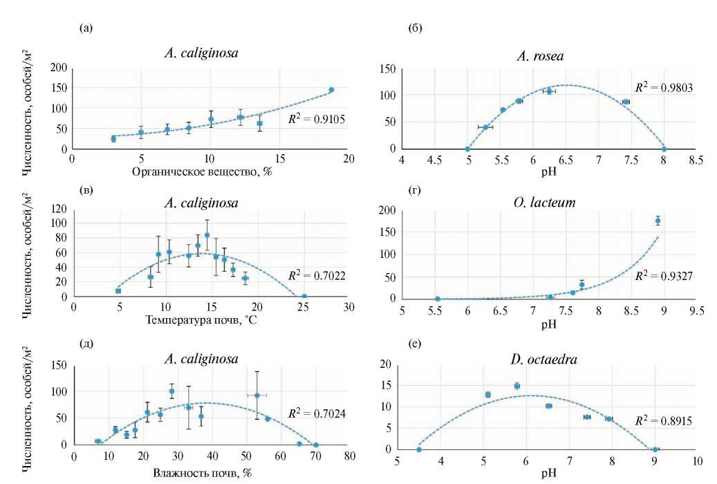 Выявлена положительная корреляция численности вида с рН (r = 0.70, n = 10, p < 0.05) и отрицательная с содержанием органического вещества (r = –0.81, n = 10, p < 0.05). Вид более многочислен в щелочных почвах (рис. 2г).