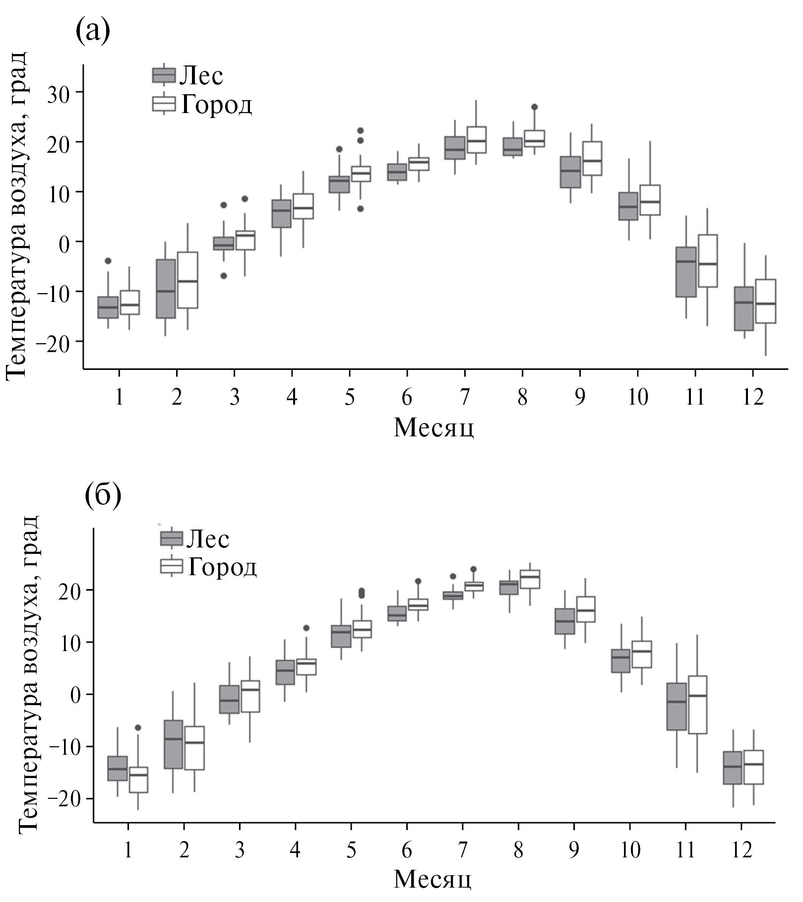 Рис. 2. Диаграммы размаха месячных температур в городе и в лесу в 2019 (А) и 2020 (Б) гг. Прямоугольники показывают диапазон от 25-го до 75-го процента данных, черные горизонтальные линии внутри – медианы, планки составляют 1.5 межквартильного размаха, точками обозначены «выбросы».