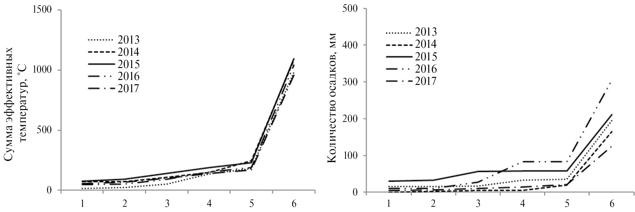 Рис. 3. Суммы эффективных температур и суммы осадков на даты начала шести фенологических фаз черемухи обыкновенной (1 – начало сокодвижения, 2 – набухание почек, 3 – раскрытие почек, 4 – развертывание листьев, 5 – начало роста побегов, 6 – одревеснение побегов).