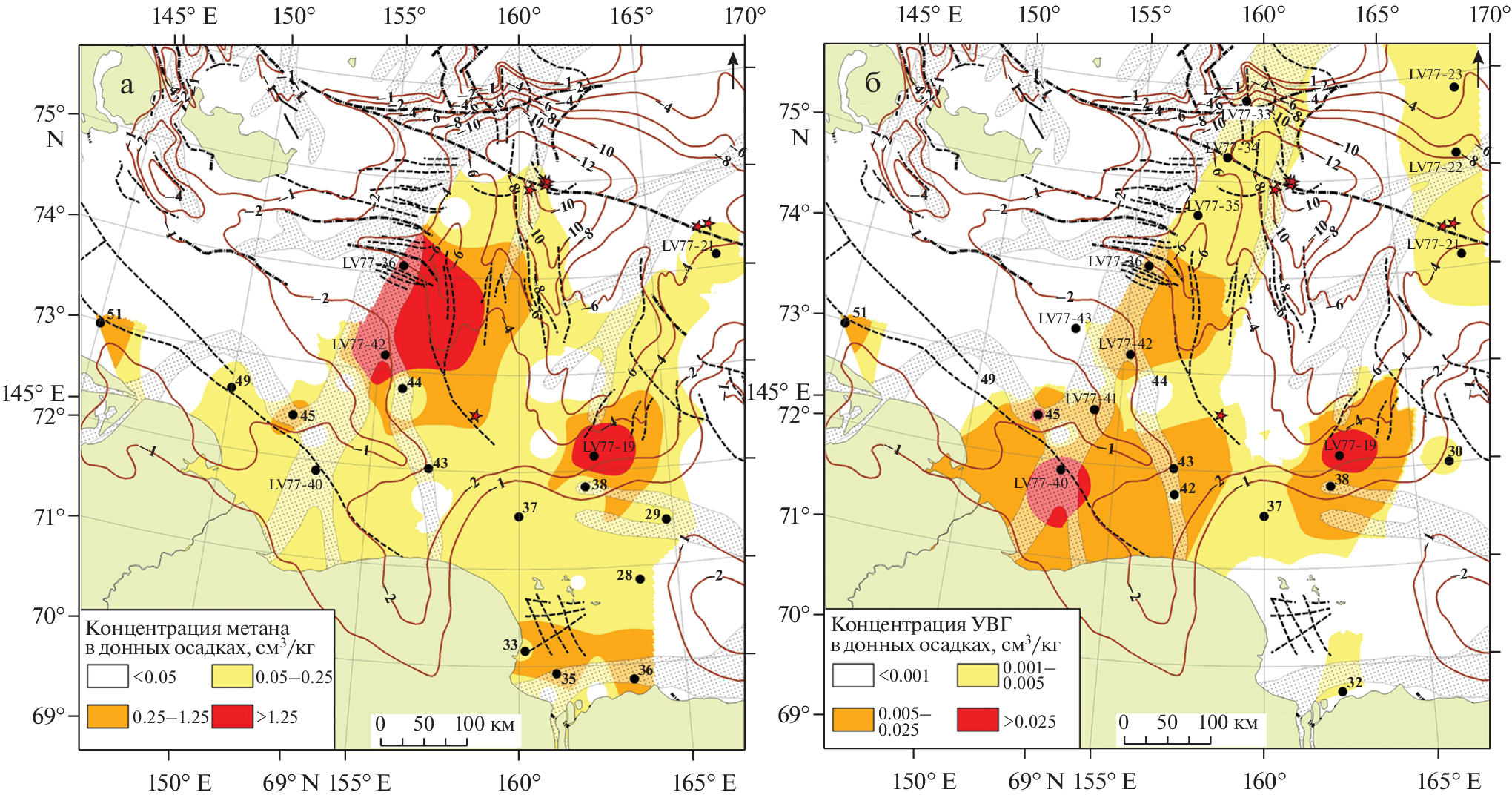On the basis of lithological and gas geochemical studies and a comprehensive interpretation of the available materials, the main factors of the formation and distribution of grain size distribution, water-physical properties, organic saturation, concentrations and geochemical parameters of hydrocarbon gases in seafloor sediments of geostructures of the western part of the East Siberian Sea are summarized and analyzed. It has been established that the sediments of the northern and central parts of the study area are represented by aleurite-pelites, the southern ‒ by aleurite-pelite-psamites with variations in Corg values ‒ 0.6–2.0%, natural humidity and density ‒ 18–43% and 1.5–2.0 g/cm3, open porosity ‒ 17–33%, the concentrations of methane and its homologues are 0.001–5.934 and 0.00003–0.0312 cm3/kg, the molecular mass of the hydrocarbons fraction, the “wetness”, “dryness” coefficients, and the coefficients of the transformation are 16.05–22.6 g/mol, 0.2–51%, 1–1999, 0.2–50.8 and δ13С‒СН4 (–82.7…–38.4‰). Based on the values of gas geochemical parameters, eleven types of gas sources were identified in bottom sediments. In the process of research, it was found that the formation of hydrocarbon anomalies in sediments is mainly associated with their reservoir properties, Corg content and depths of their sampling, as well as with the complex influence of geological factors, the main of which are the gas saturation of the underlying sediments and the type of gas sources, discontinuous and plicative tectonics, geostructures position, thickness of Quaternary deposits, coal and gas content and age of the folded base. To a lesser extent, anomalies of hydrocarbon gases are associated with the lithological composition and density parameters of sediments.