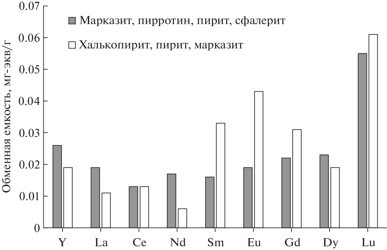The article presents the results of sorption of rare earth metal cations on samples of deepsea polymetallic sulfides of the hydrothermal fields of the Broken Spur and TAG of the Mid-Atlantic Ridge. The main minerals of these samples were respectively marcasite, pyrrhotine, pyrite, sphalerite and chalcopyrite, pyrite, and marcasite. It has been established that these sulfide minerals of iron, copper and zinc are natural adsorbents. The exchange capacity of sulfide minerals for rare earth metal cations is in the range of 0.006‒0.061 mg-eq/g. The exchange complex of sulfide minerals consists of cations of alkaline, alkaline-earth metals and basic cations of metals of the crystal lattice – Fe, Zn, Cu (in very limited quantities). The mechanism of absorption of rare earth metal cations is ion-exchange, equivalent to the exchange cations of sulfide minerals. It was found that in the composition of sulfide minerals, rare earth metal cations are almost completely in sorbed form (more than 90% of the total amount); The chemically bound form can be, apparently, only for Lu and Dy cations. The mineral composition of sulfide deposits is preserved in the products of exchange reactions, new phases do not appear.
