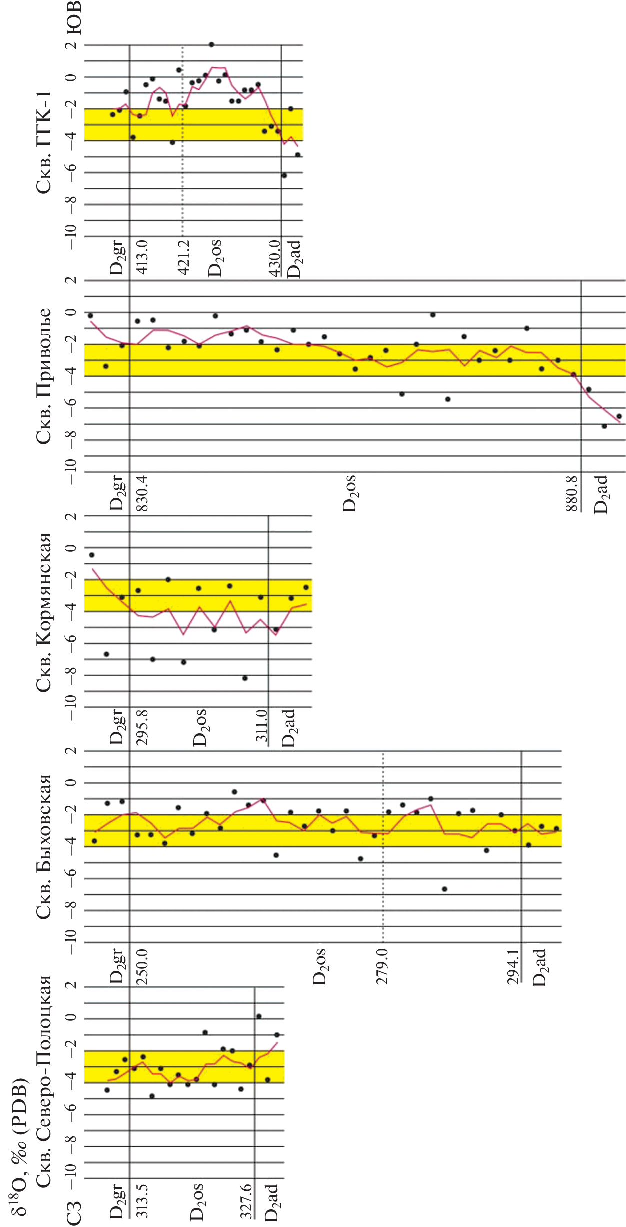 The complex interpretation of distribution of δ13C and δ18О in carbonates, δ34S and 87Sr/86Sr in gypsum from the Osveya horizon (Lower Eifelian) on the territory of Belarus showed that significance of diagenetic isotope signals is low and variations of the values can be consistently explained within a sedimentation model. Along with intervals of sections with standard marine δ13C values, there are negative excursions of the parameter (up to –7…–11‰) marking segments of sequence with carbonate-sulphate rocks and smaller scale sulphate manifestations. The excursions correspond to evaporite episodes when the basin shallowed and, probably, dismembered into separate ponds. This led to increasing the role of continental water enriched with soil carbon in the geochemical system of sedimentation due to the land runoff activation and/or shallowing. Continental water could come from for a long time exposed land areas where the Eifelian deposits are absent until now as well as from periodically existing islands. Oxygen isotopic composition does not react to δ13C negative excursions by similar shifts due to the possible absence of significant difference between the δ18О values of atmospheric precipitation, giving rise to land water, and seawater in low latitudes where the territory of Belarus was situated in the Devonian. In 40% of the studied samples, the δ18О values range from –4 to –2‰, corresponding to the Eifelian “plateau” (~–3‰) in the generalized chemostratigraphic curve in the generalized chemostratigraphic curve constructed using calcite of brachiopod shells from several regions of the world. The δ18О values higher than –2‰ (44% of cases), probably, are the result of water evaporation, while figures < –2‰ (16%) which may decrease up to –7.0…–9.5‰ at the peaks of evaporite episodes, are caused by water heating (sometimes very significant) during the basin shallowing. The activation of continental water role accompanying evaporite episodes is supported by the fact that the 87Sr/86Sr ratio in the Osveya horizon gypsum (0.708402–0.708742) is much higher than that of the Eifelian seawater according to a global estimate (0.70772), while δ34S of gypsum (15.5–21.2‰) in more than a half of the analyzed samples is lower than figures characteristic of the Middle Devonian seawater sulphate (19–20‰).
