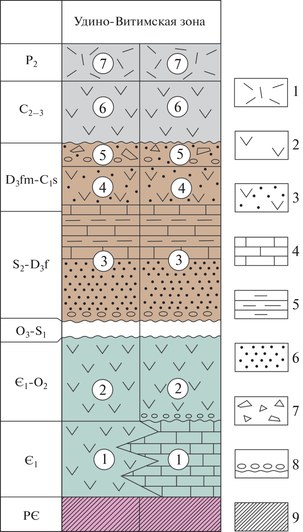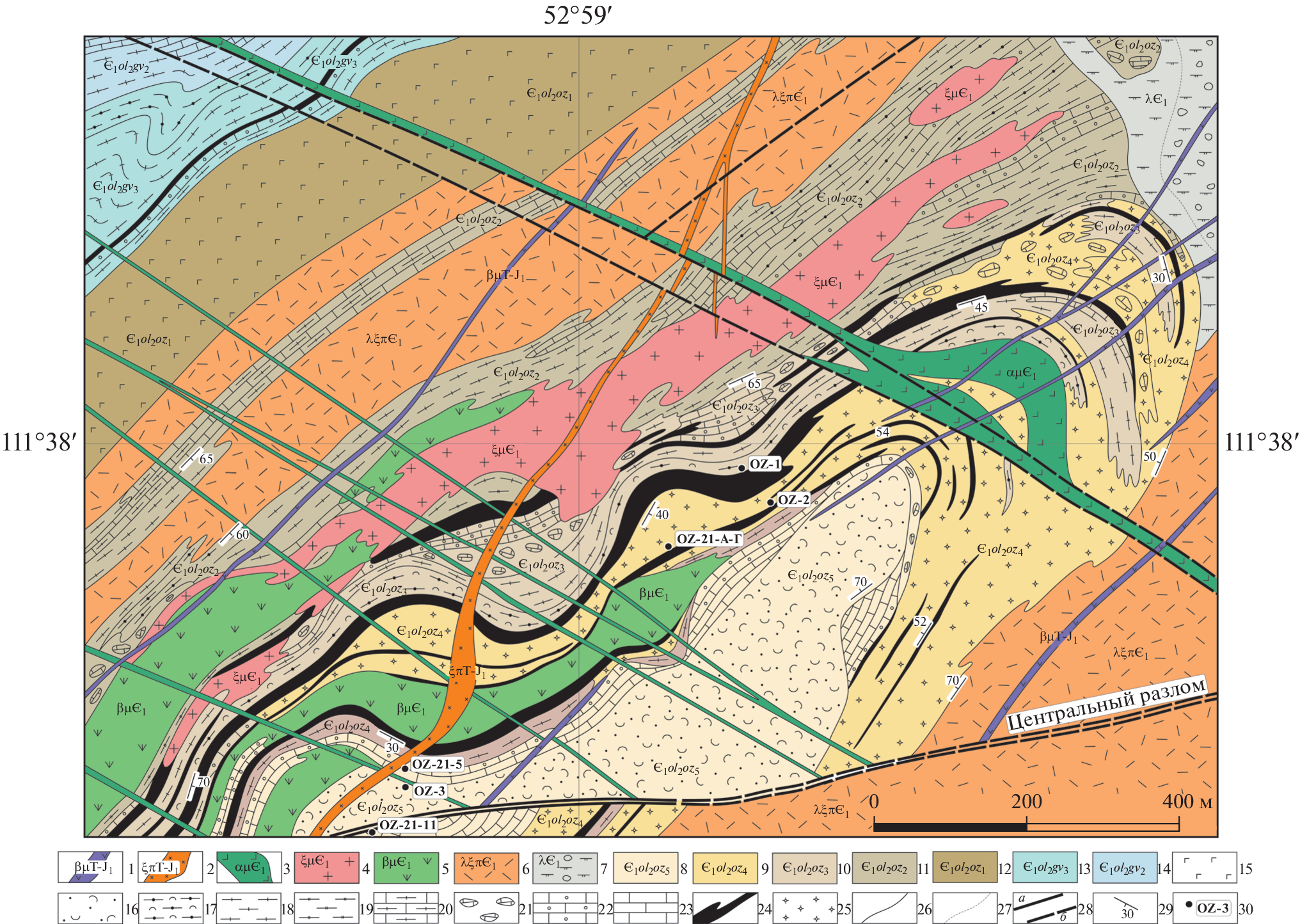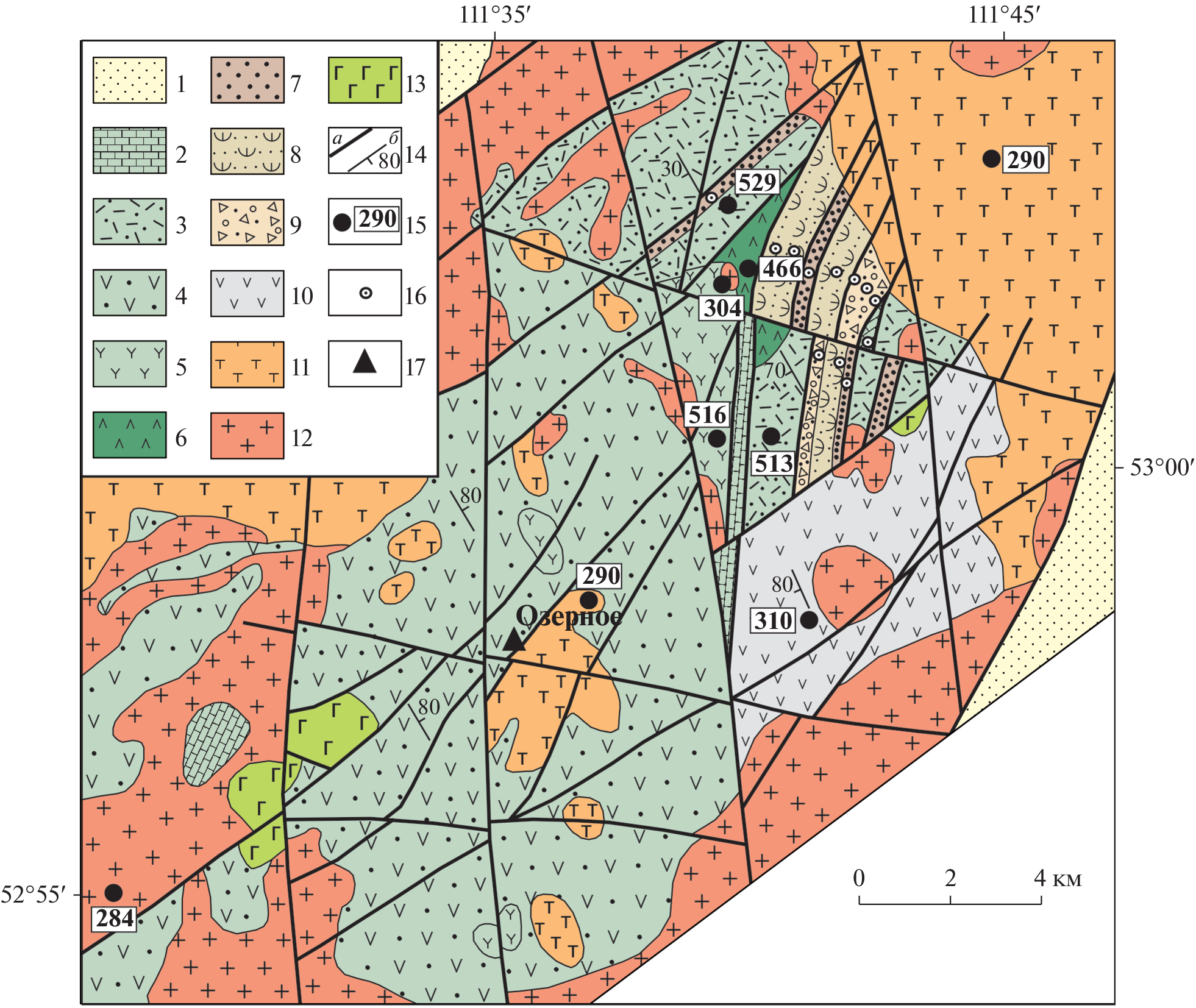 The article presents the results of biostratigraphic and U-Pb geochronological (detrital zircons) studies of the volcanic-terrigenous lacustrine member of the upper subformation of the Lower Paleozoic Oldyndinskaya Formation, which contains pyrite-polymetallic ores of the Ozernoye deposit (Kurbino-Eravninsky ore region, Western Transbaikalia). The first, second and “crystal tuff” productive horizons of the first ore-bearing level of the ozernaya member were studied. It is represented by an alternation of tuffs, calcareous, siliceous, carbonaceous tuffites, pelitomorphic limestones, limestone gravelstones with interlayers and lenses of mine-ralized tuff-conglobreccia and layers of banded siderite pyrite ores. For the first time, bryozoans, algae, and palynoflora were found in calcareous tuffaceous siltstones and limestones of the second and “crystalline tuff” productive horizons. These data indicate the Early Carboniferous, Tournaisian time of sediment accumulation. The results of U-Pb geochronological studies of detrital zircons from the mineralized tuff-conglobreccia of the third productive horizon limit the lower limit of the rock formation time as not older than the Late Cambrian.
