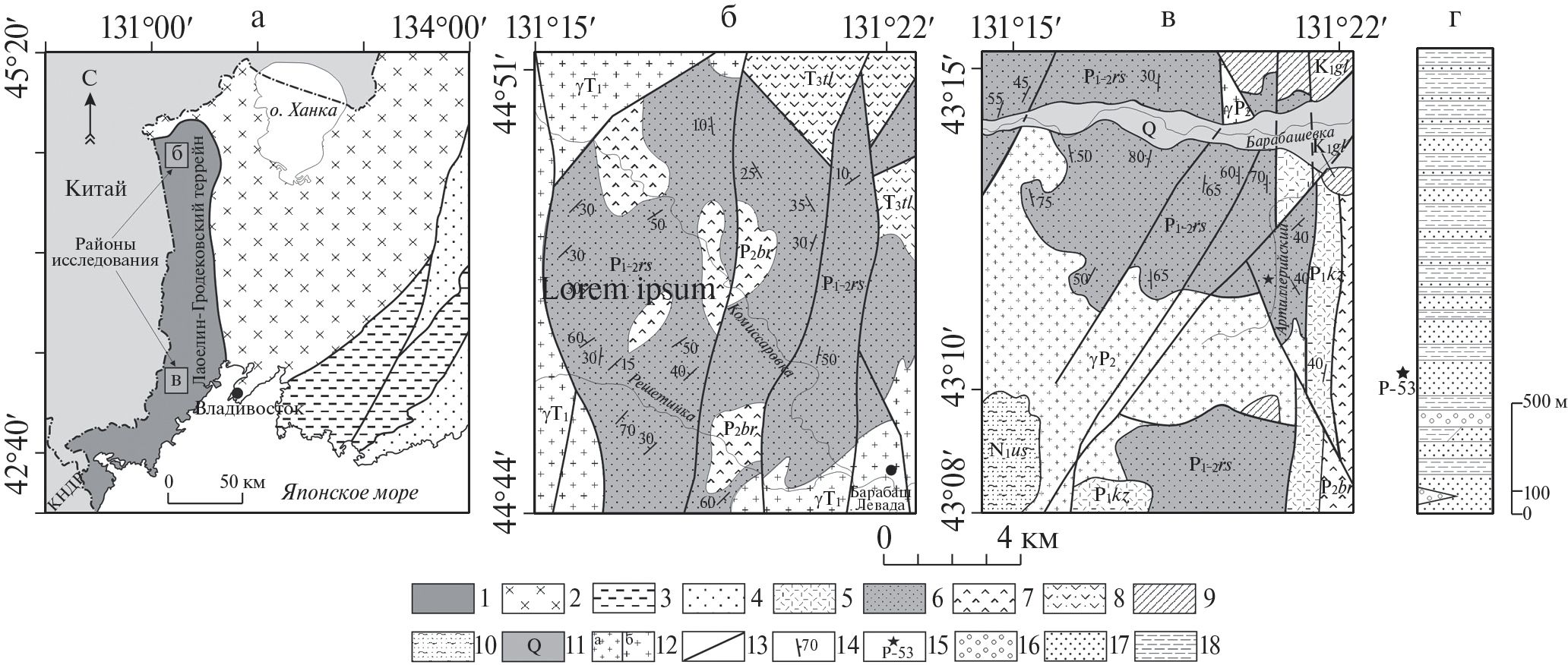 1–4 – террейны: 1 – Лаоелин-Гродековский, 2 – раннепалеозойского Бурея-Цзямусы-Ханкайского орогенного пояса (супертеррейна), 3 – раннепалеозойской активной окраины, 4 – мезозойского Сихотэ-Алинского орогенного пояса; 5–11 – свиты: 5 – казачкинская (P1kz), 6 – решетниковская (P12rs), 7 – барабашская (P2br), 8 – тальминская (T3tl), 9 – галёнковская (К1gl), 10 – уcть-суйфунская (N1us); 11 – четвертичные отложения (Q); 12 – граниты и гранодиориты: а – позднепермские (γP3), б – раннетриасовые (γТ1); 13 – разломы; 14 – элементы залегания; 15 – место отбора пробы на U–Pb-геохронологическое датирование детритовых цирконов и ее номер; 16 – конгломераты и гравелиты; 17 – песчаники; 18 – алевролиты и аргиллиты.