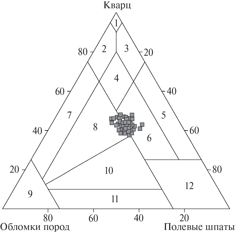 Поля типов песчаников: 1–4 – кварцевые песчаники (1 – мономиктовые кварцевые, 2 – кремнекластито-кварцевые, 3 – полевошпатово-кварцевые, 4 – мезомиктовые кварцевые); 5 – чистые или собственно аркозы; 6 – граувакковые аркозы; 7 – кварцевые граувакки; 8 – полевошпатово-кварцевые граувакки; 9 – собственно граувакки; 10 – кварцево-полевошпатовые граувакки; 11 – полевошпатовые граувакки; 12 – кристаллотуфы.