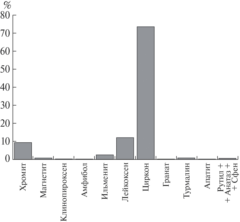 В песчаниках свиты изучены состав, содержание и соотношение между отдельными тяжелыми обломочными минералами и их ассоциациями. Подсчитывались только обломочные минералы, а аутигенные из подсчета исключались, чтобы максимально надежно выявить состав и относительную роль различных источников питания. На рис. 3 показано соотношение между средним содержанием отдельных минералов.