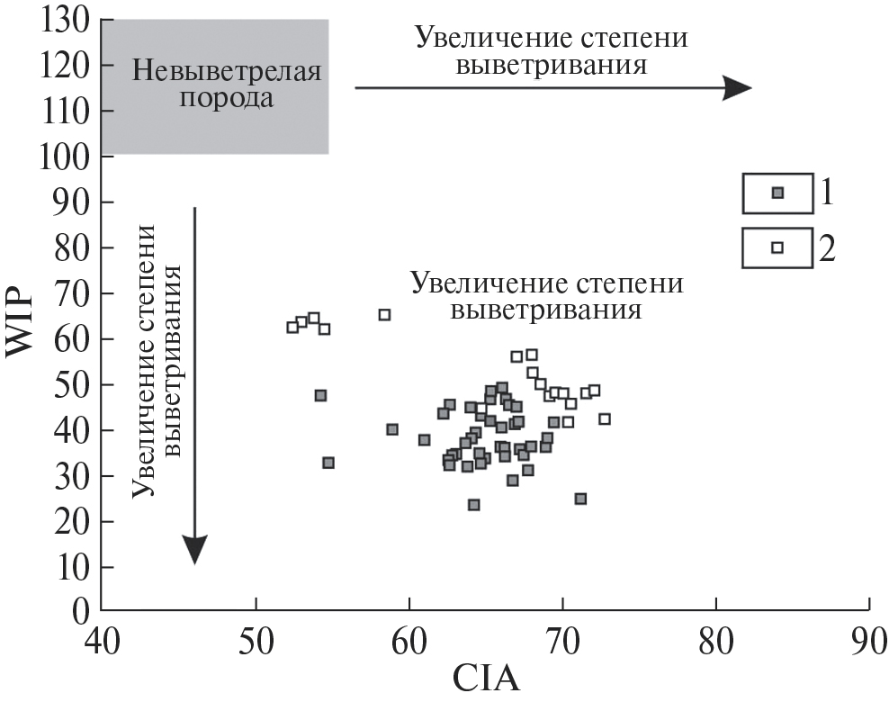 Рис. 5. Диаграмма степени химического выветривания CIA–WIP для песчаных и глинисто-алевритовых пород решетниковской свиты [Bahlburg, Dobrzinski, 2011]